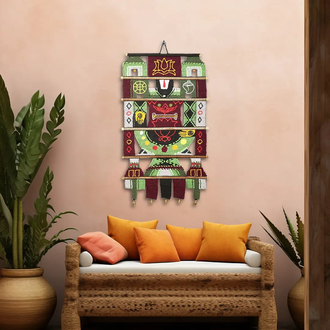 Multicolored Cotton Handmade Tantra Wall-Hanging with Wooden Beads and Brass Bells from Maharashtra