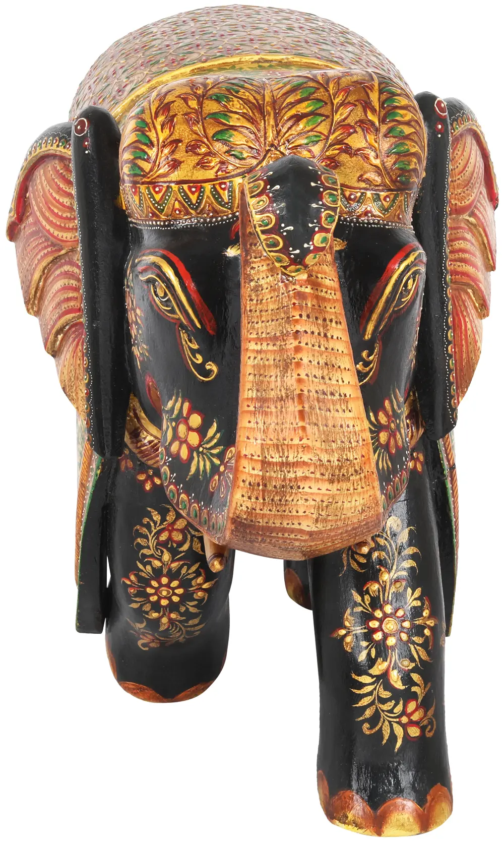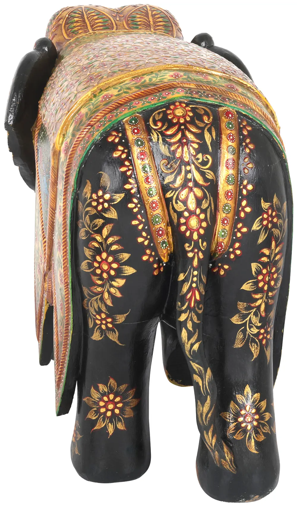 The beauty of this piece lies not only in its overall design but also in the individual elements that come together to create such a stunning work of art. The elephant's blanket is a canvas of floral motifs and geometric patterns, each carefully hand-painted to perfection. The contrast between the vibrant colors and the rich black base creates a striking visual impact, drawing the eye to the intricate details. Even the elephant's face is a study in detail, with expressive eyes and delicate floral accents that convey a sense of gentle power. The use of wood as the primary material gives the statue a natural warmth and texture, adding to its overall appeal. The smooth, polished surface enhances the richness of the colors, while the sturdy construction ensures that this piece will be a cherished heirloom for generations to come.