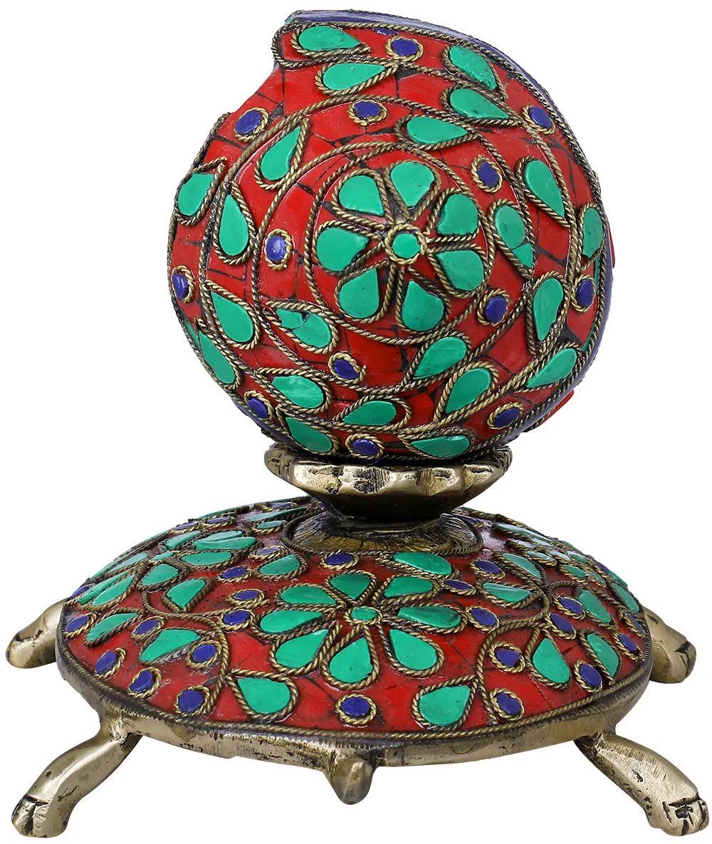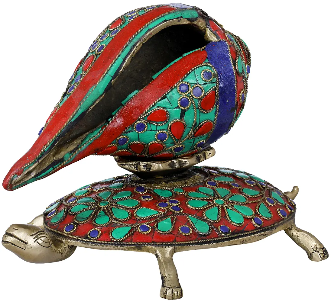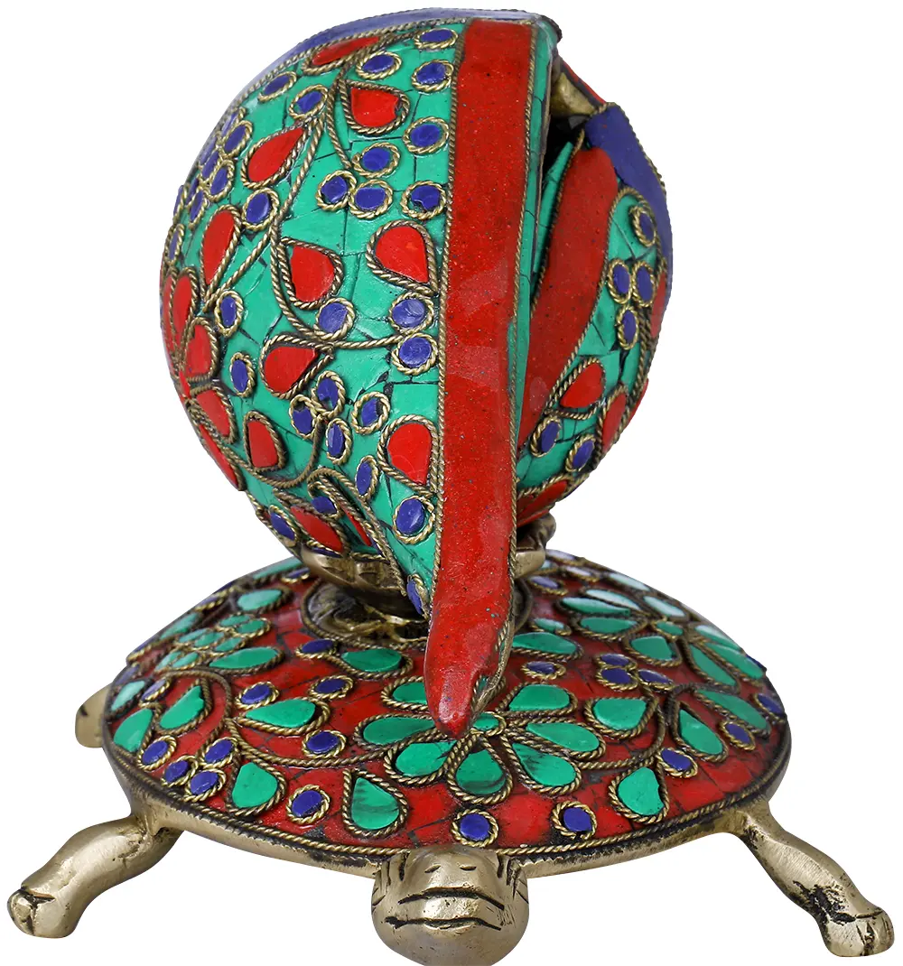 The proud, tortoise having a virtuous conch atop its eye-catching spherical shell, appears happiest in the world. The whole marvelous structure is skilfully engraved and grooved with luxurious, Royal Meenakari designs from Jaipur / Nathdwara employing Brass and dominated by applying traditional Mughal colors- rich ruby red, green, and royal blue enamels. Care has been taken that the pious conch first be positioned in a little brass plate over the tortoise. This exclusive, lovely Vastu Conch on Tortoise looks so cute and tempting that eyes cannot be detached from it.