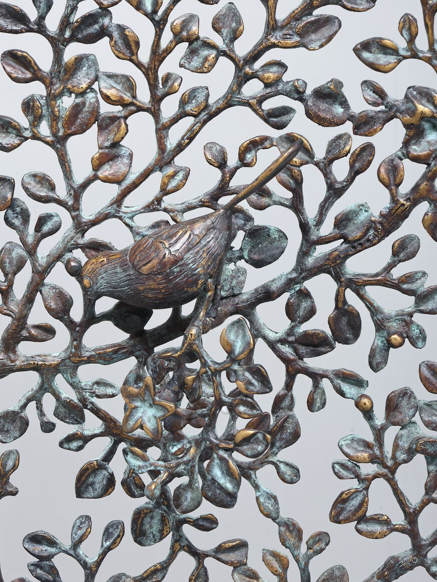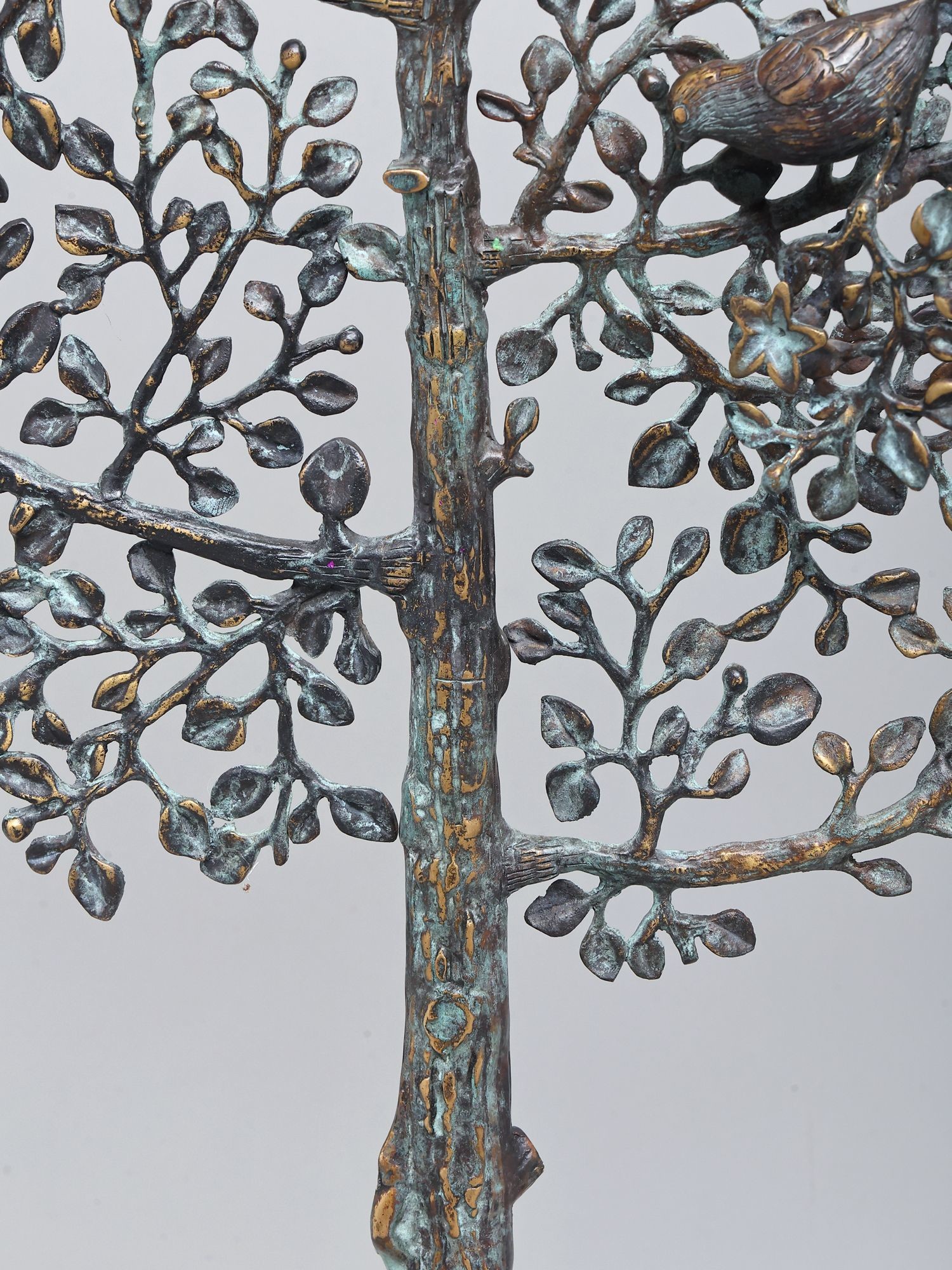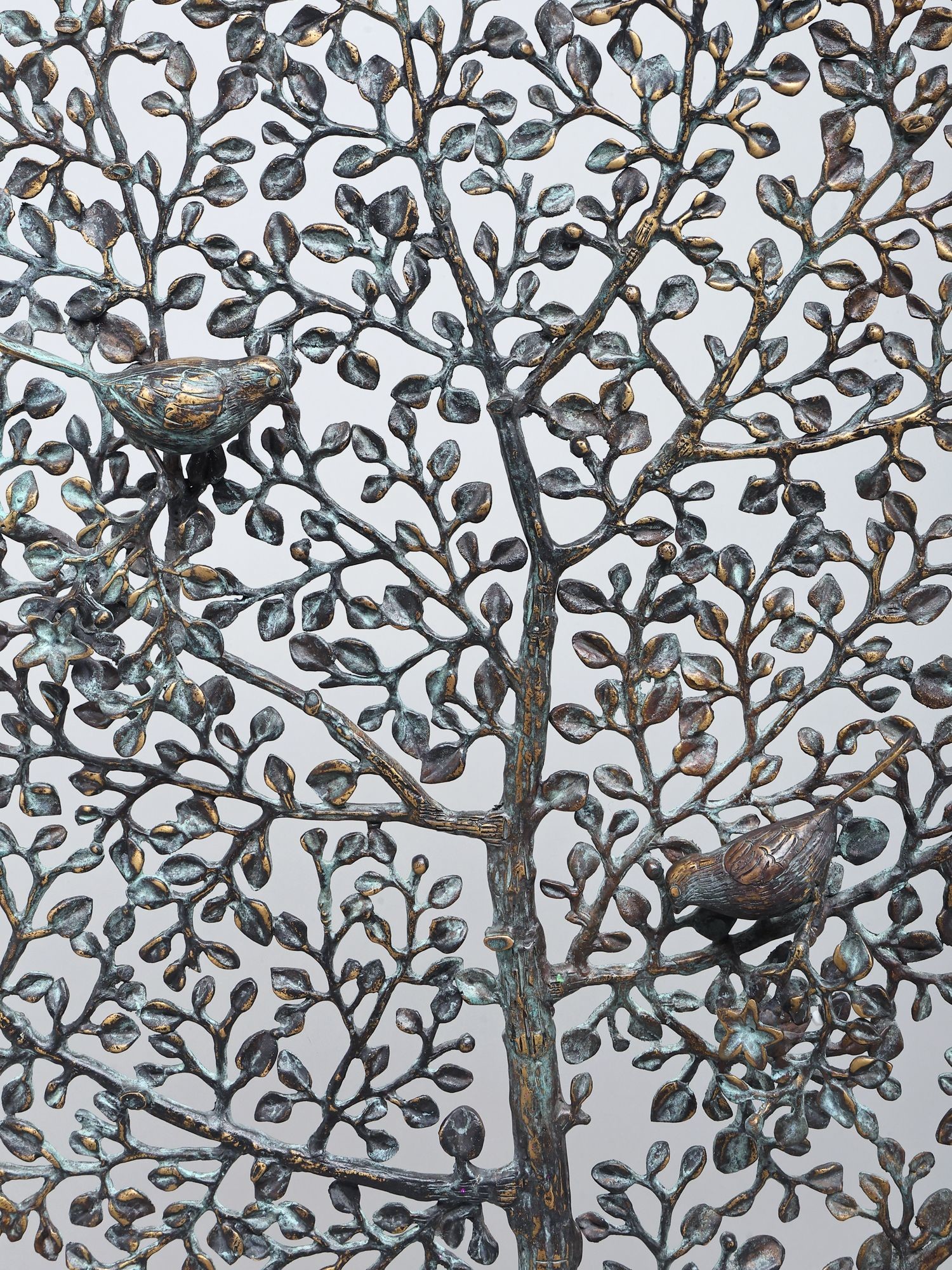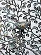 Intricately designed metal sculpture depicting the Tree of Life with birds perched on its branches.