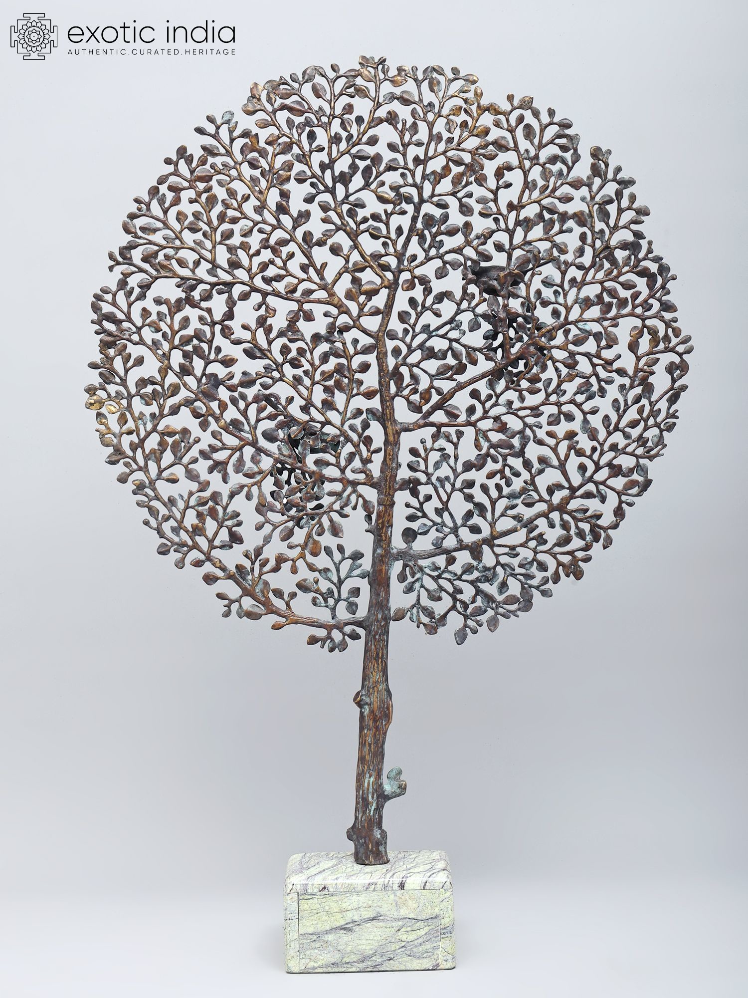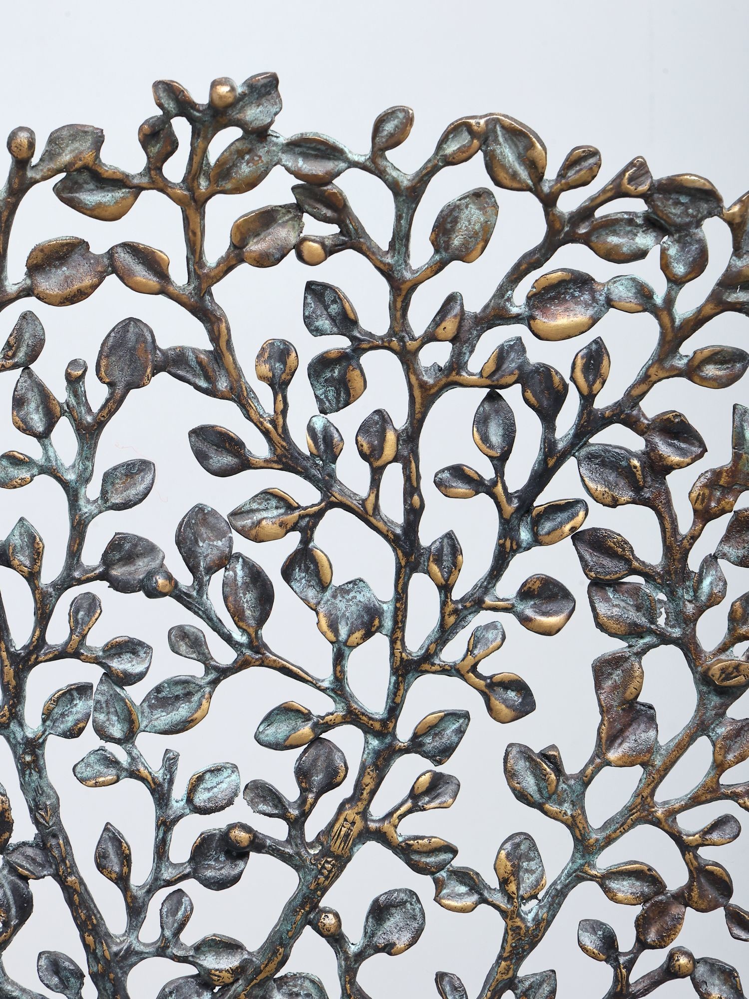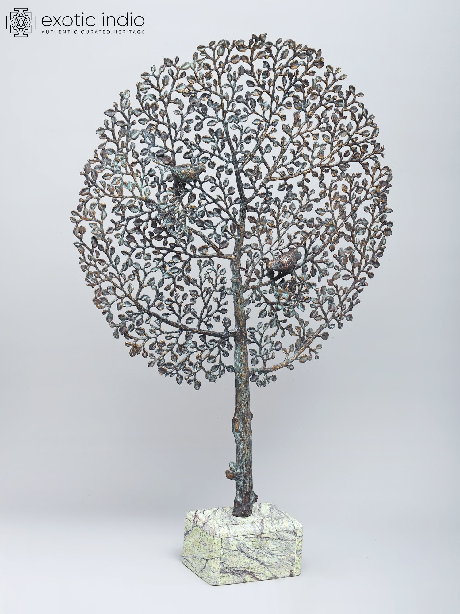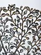 Intricately designed metal sculpture depicting the Tree of Life with birds perched on its branches.
