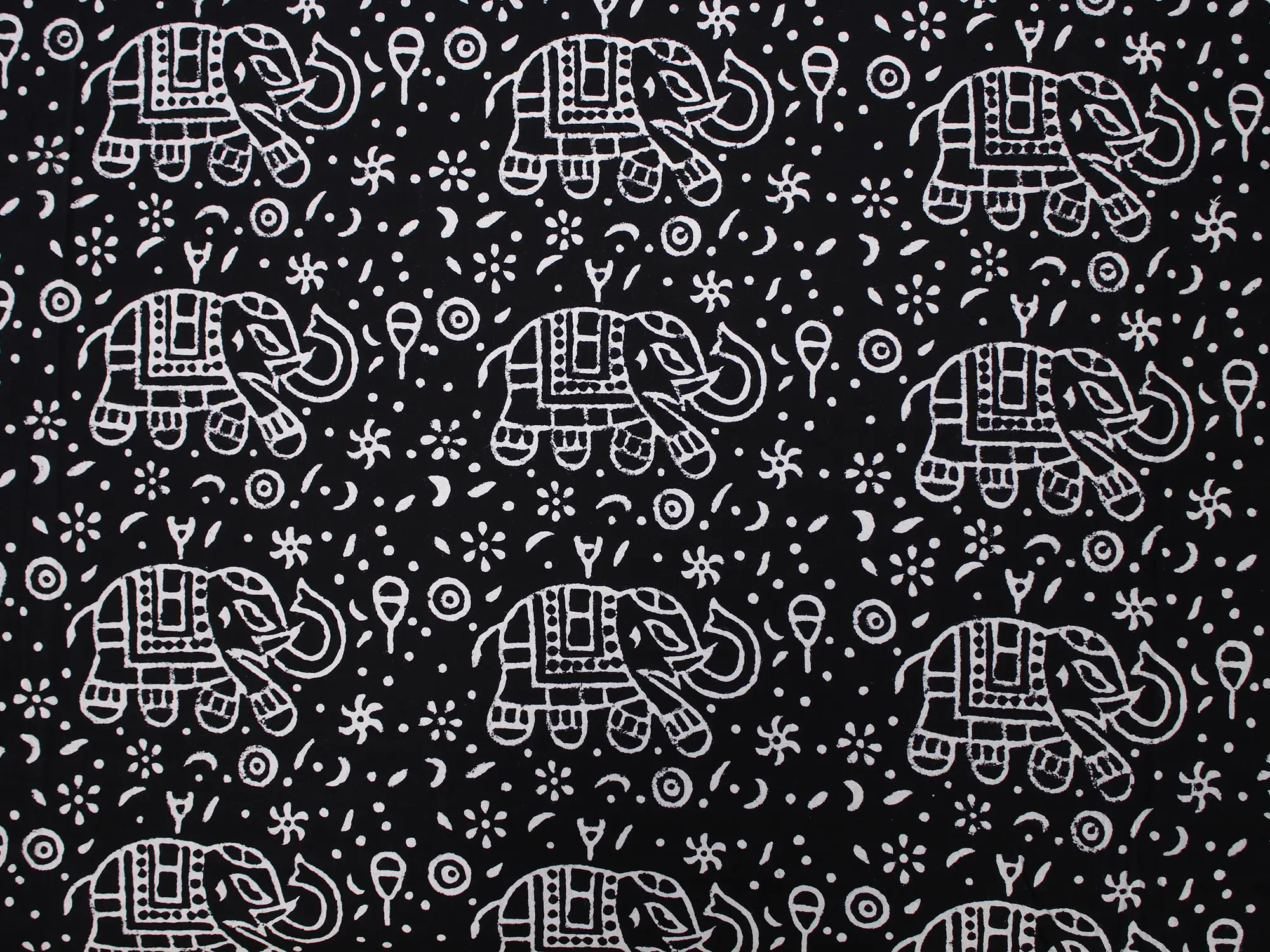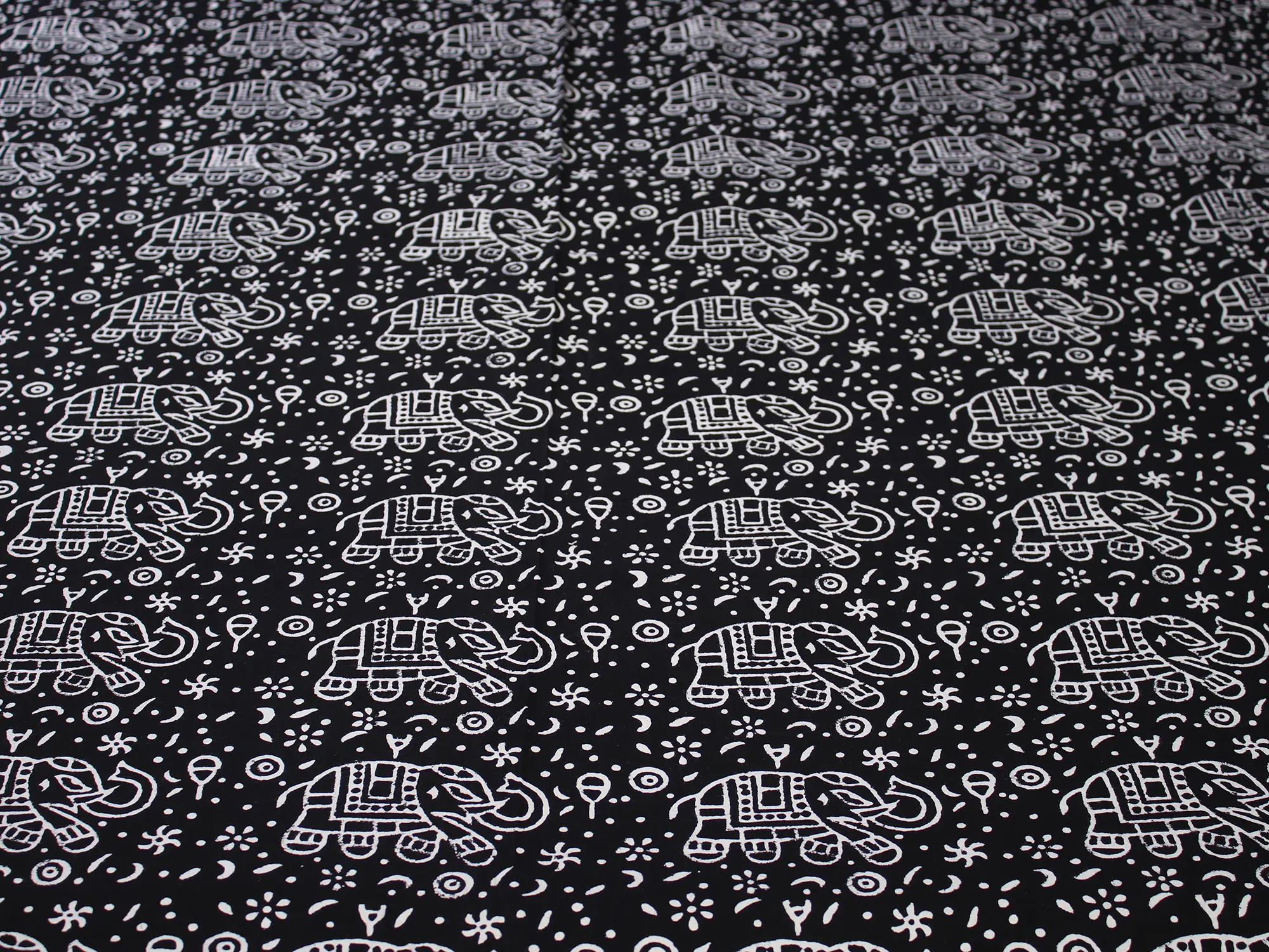 Black and white is a timeless combination, and this Midnight-Black Queen Size Cotton Bedsheet with an All-Over Elephant Handblock Print does it perfectly. The sheet is predominantly black, adorned with white elephants and other motifs. The white designs stand out beautifully, adding an attractive touch.