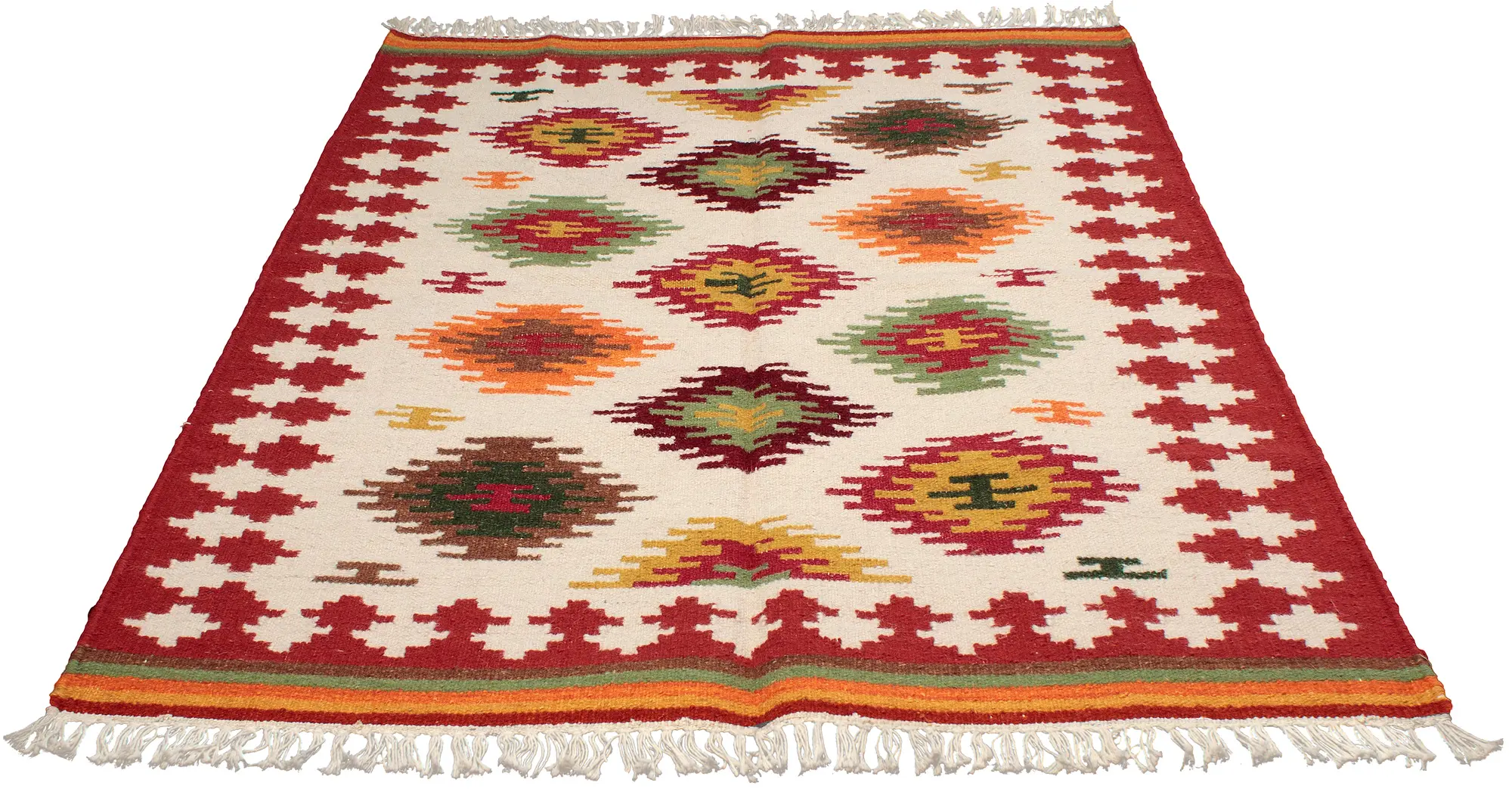A background of pale cream straddling lively greens and oranges in the foreground makes for a dhurrie that is cheerily fashionable. Zoom in on the picture to note how precise, how sharp are the warp and weft yarns that have gone into the classic kilim weave of each motif on this dhurrie. The dark brick-red of the border contains the dual-motif patterns and sets off the thick, pristine tassels along the edges.