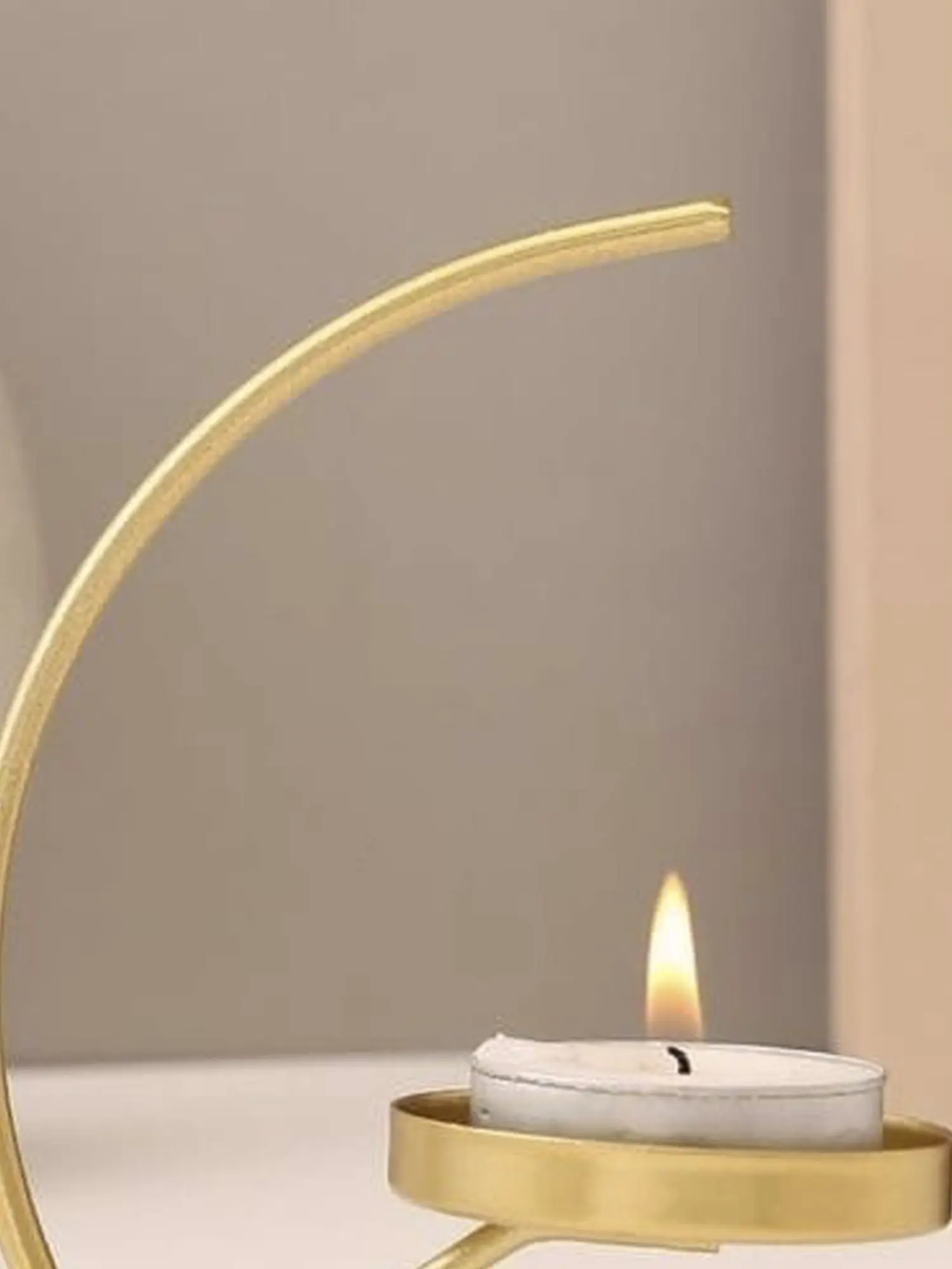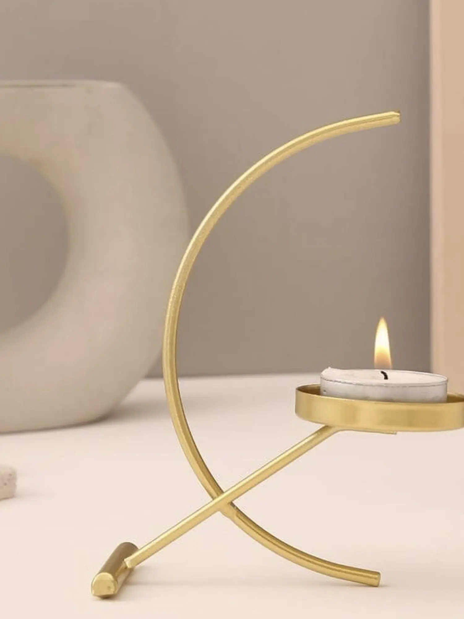 With modern design and traditional brass combined, this elegant candle stand is a charming table decor for contemporary homes. Blending utility and refinement, the candle stand features a crescent moon-shaped frame, with a diagonal stand which supports the candle stand. Simple and sophisticated, the candle stand is ideal for small, cozy spaces, to add a gorgeous light to your home.