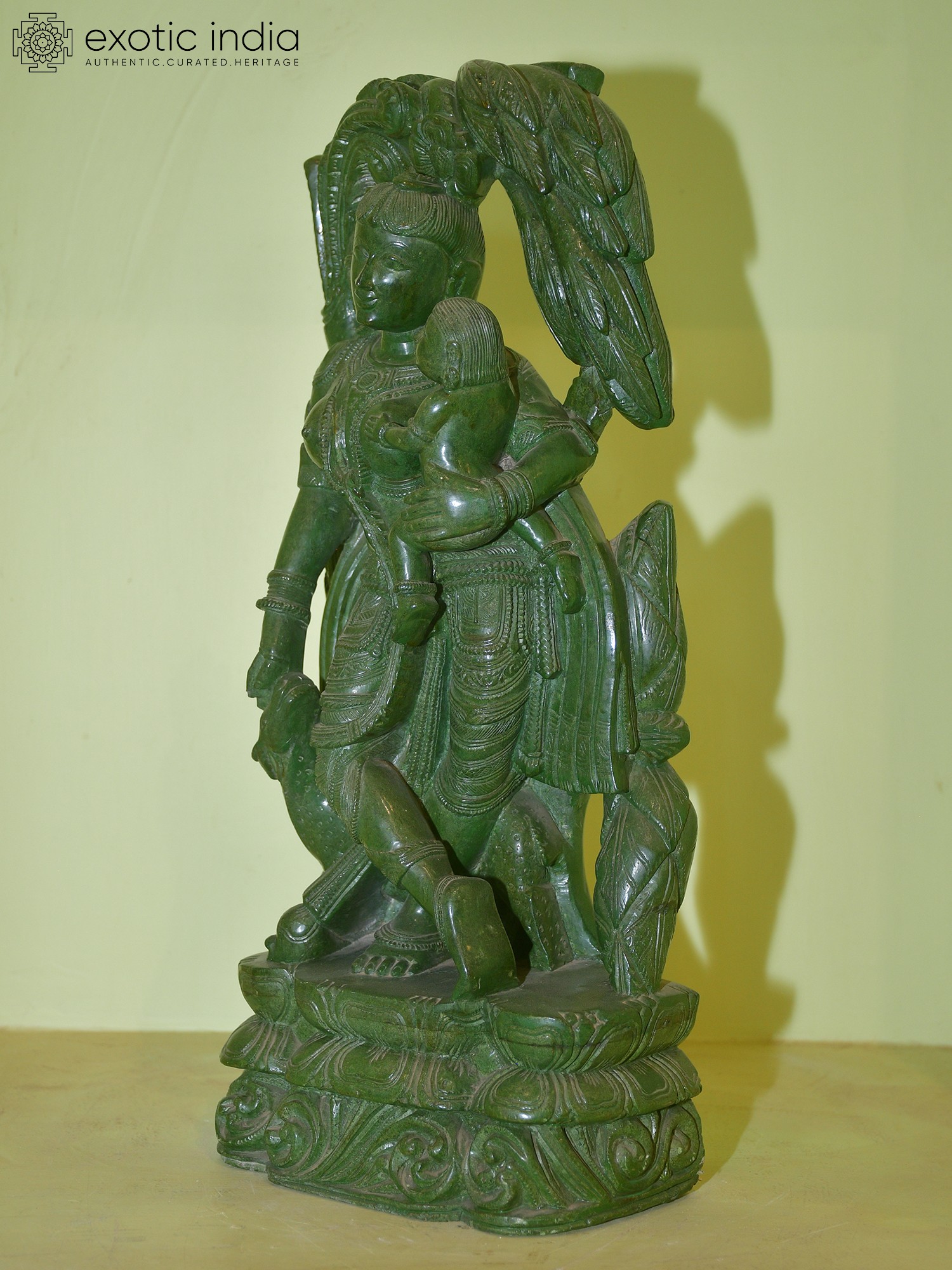 And yet, the choice of green stone gives this traditional language a new vitality. The sculpture feels familiar and ancient, but also freshly imagined- a timeless archetype emerging from a living, breathing material.