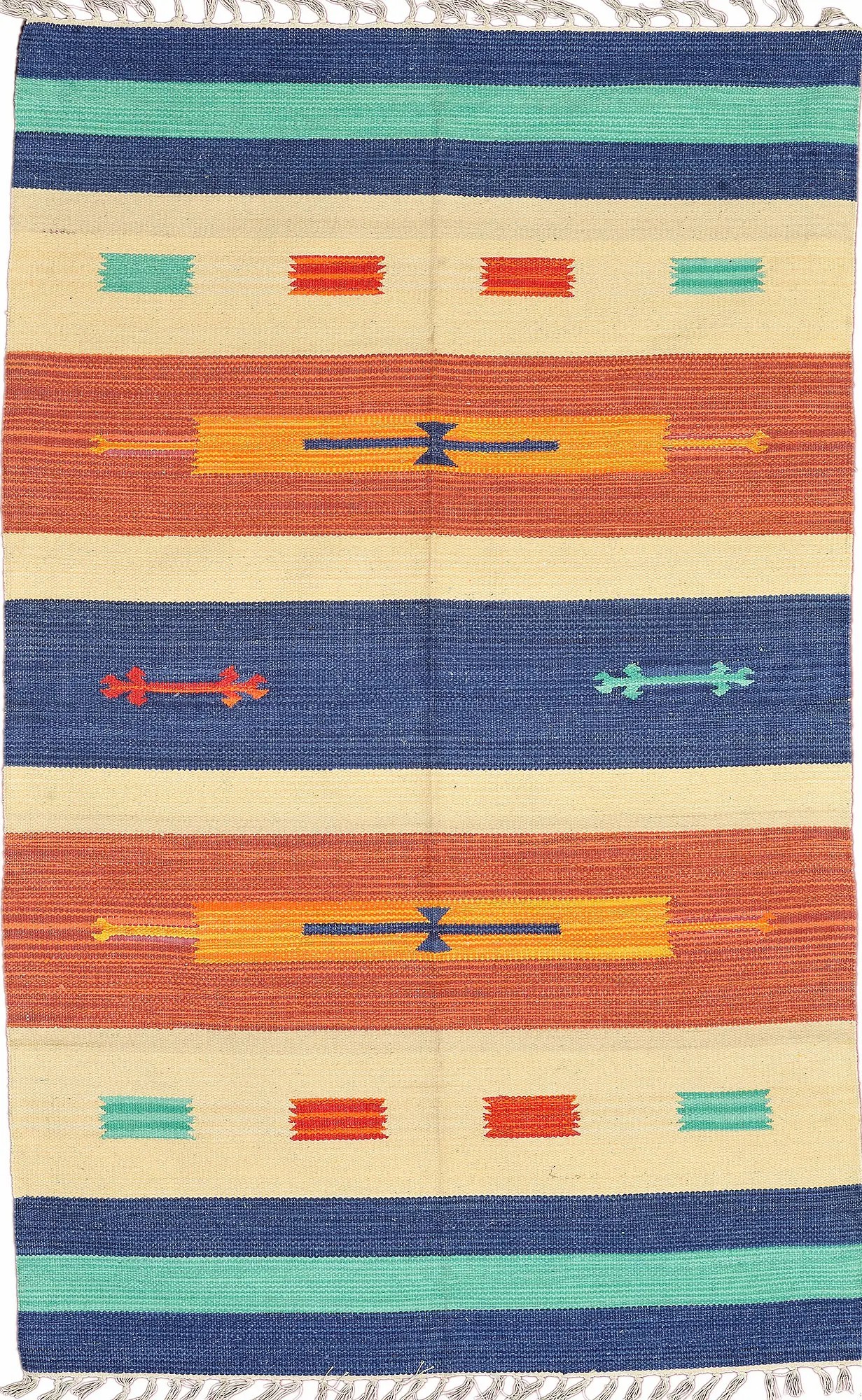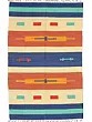 Infuse your living space with the vibrant charm of this woven cotton asana. Handmade in Sitapur, India, this piece embodies the rich textile traditions of the region. The rug’s design showcases a captivating array of colors meticulously woven together to create a visually appealing and warm aesthetic. The carefully chosen color palette blends beautifully, creating a harmonious balance that complements a variety of interior styles. From the deep blues to the earthy oranges and creams, each hue adds depth and character to the design. The incorporation of smaller, contrasting colored motifs punctuates the design, lending a touch of visual complexity and an artisan feel. The piece is finished with neatly knotted fringes, adding a playful yet elegant touch to its overall appearance.