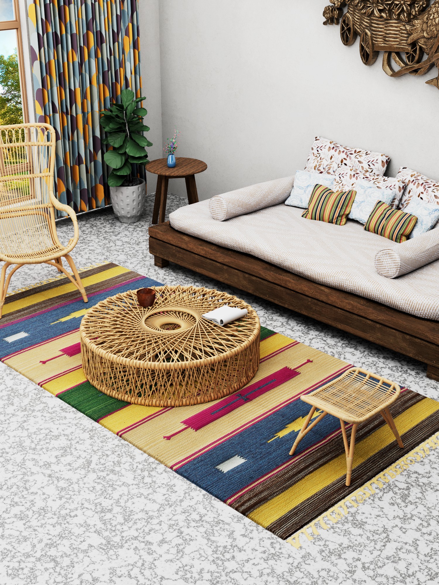This dhurrie showcases a captivating design that blends bold horizontal stripes with uniquely woven motifs. The thoughtful arrangement of colors creates a visually stimulating pattern that draws the eye and adds depth to the overall aesthetic. Each motif is carefully woven, reflecting the skill and dedication of the artisans. The tassels on both ends add a playful touch, enhancing the overall charm.