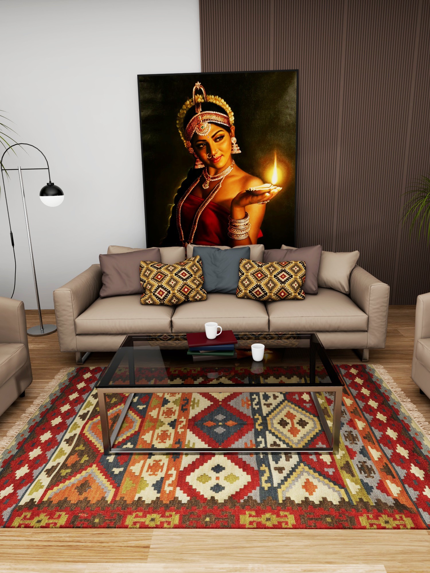Multi-colored Handloom Durri from Bhadohi with Woven Traditional Motifs