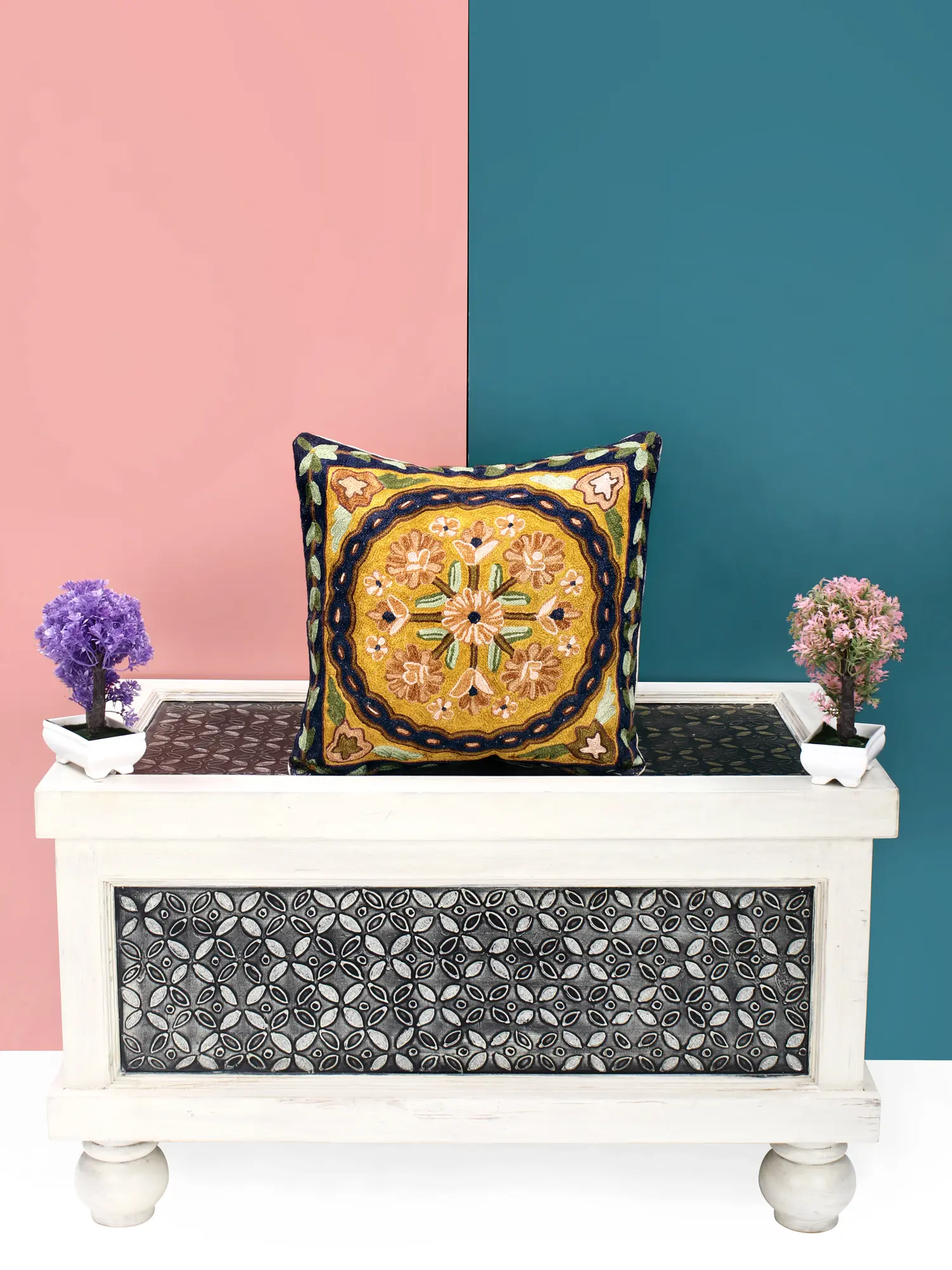 Enjoy the timeless beauty of Kashmir’s fabled Aari embroidery in your interiors, with this multicolor cushion cover, covered in an intricate Aari work. With beautiful and vivid threads, classic floral and vegetation patterns are stitched on the pure cotton cushion cover, giving it a rich appeal.