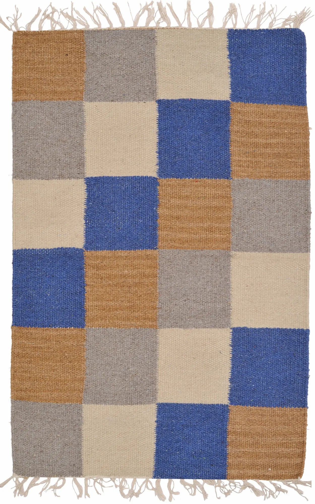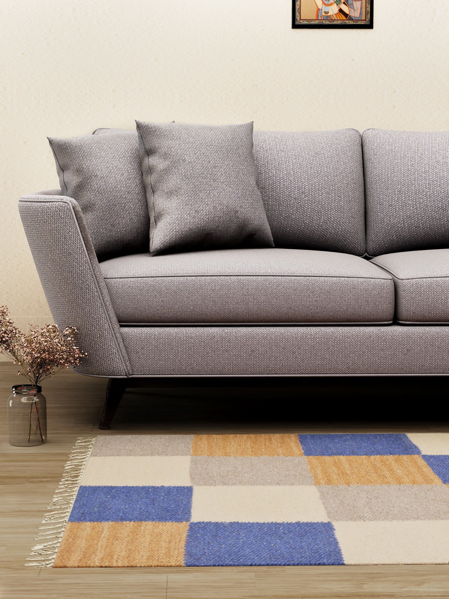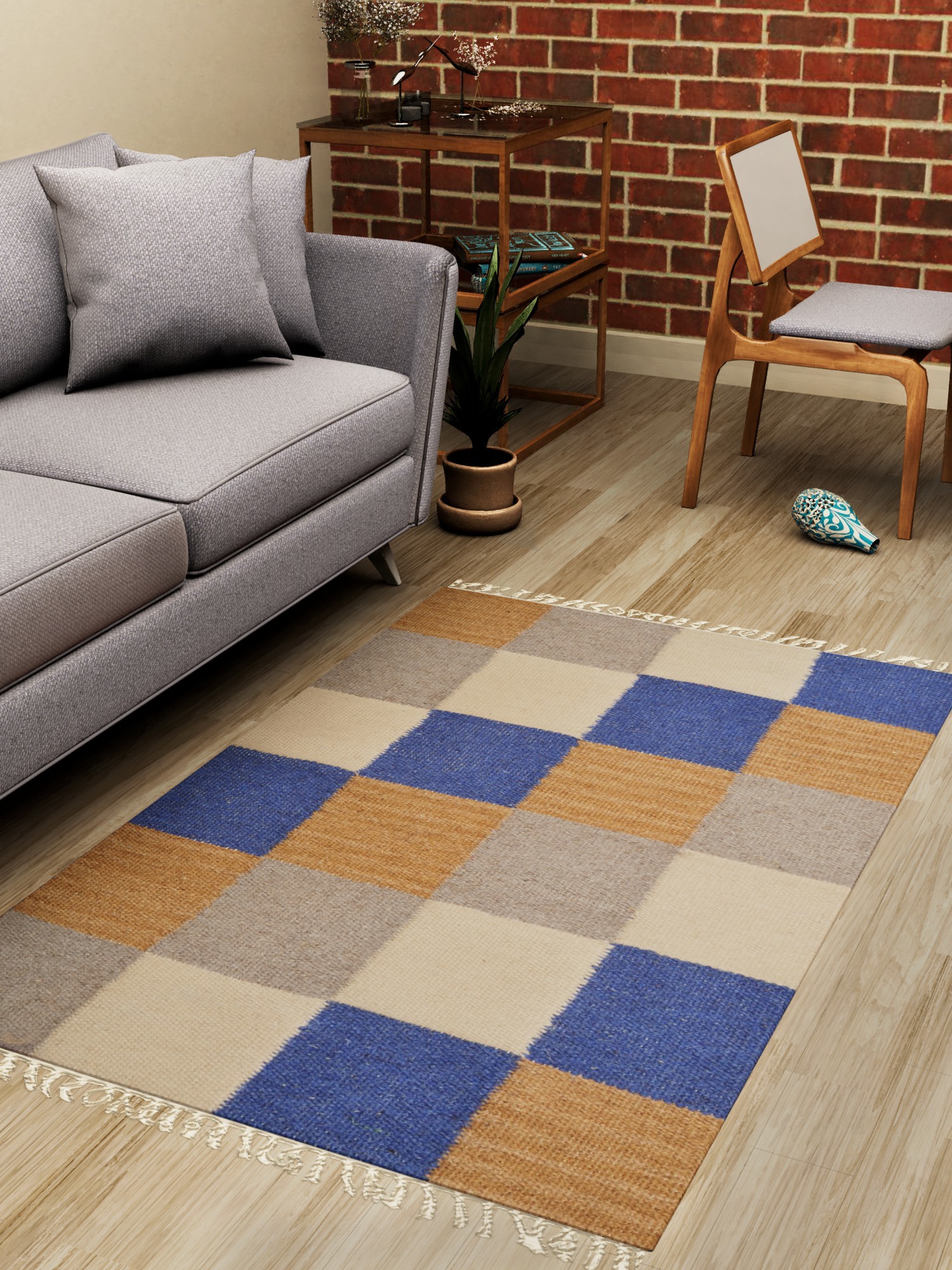 The dhurrie features a classic woven check pattern, a design that effortlessly blends with both contemporary and traditional decor styles. The color palette is a harmonious combination of neutral tones – beige, gray, and tan – accented with vibrant blue. These carefully selected colors create a sense of balance and visual interest, making the dhurrie a focal point in any room. The combination of colors adds a sophisticated touch, creating an inviting ambiance. The subtle texture of the handloom weaving further enhances the visual appeal, adding depth and dimension to the design.