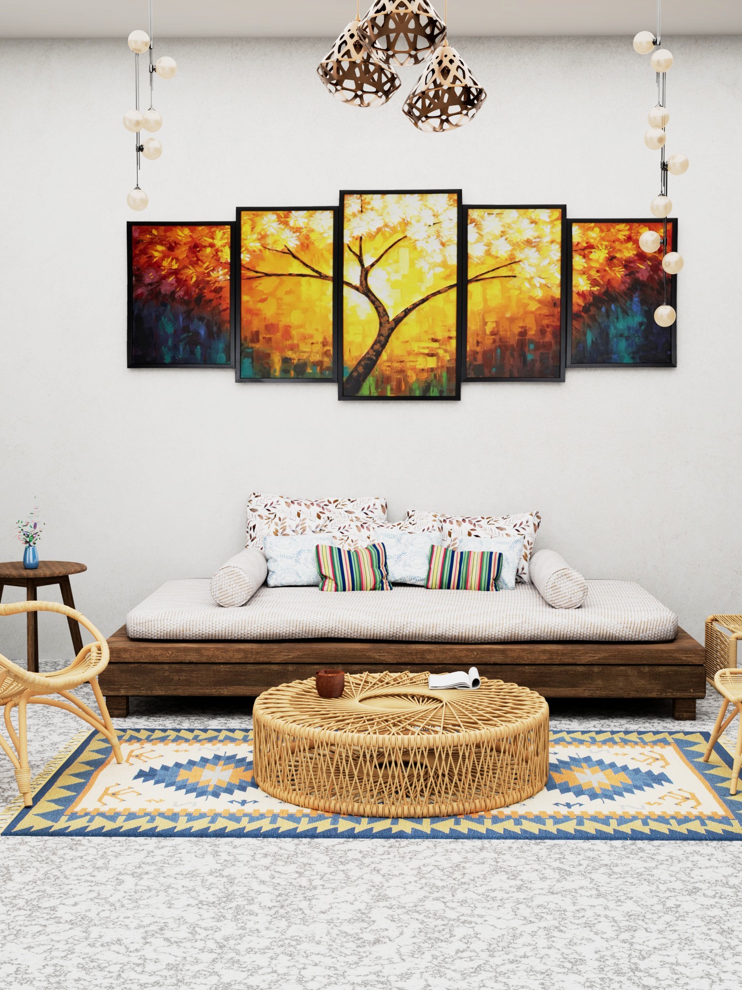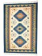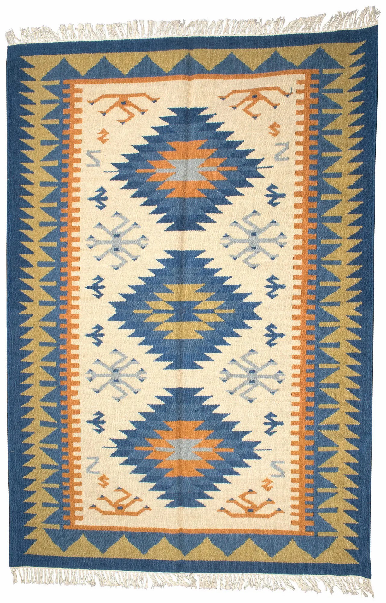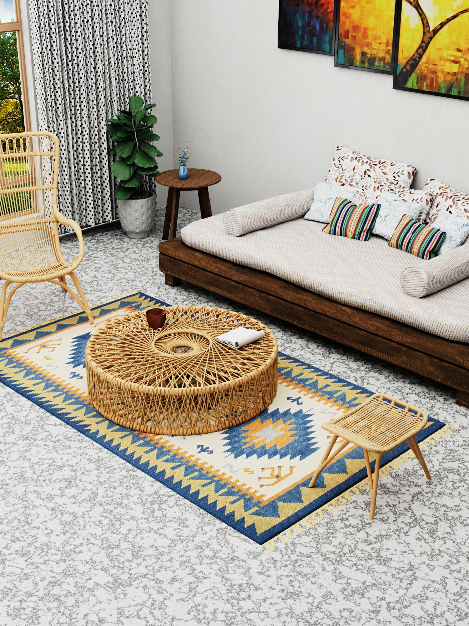 You cannot go wrong with the kilim weave, which renders this handcrafted dhurrie indisputably comfortable. Zooming in on the pictures will enable to observe the neat warp and weft yarns that have been used to create an abstract pattern in generous creams and blues. The weaving is consistent, of almost mathematical precision. This dhurrie will add great cosiness to the typically Indian experience of lying down on the floor.