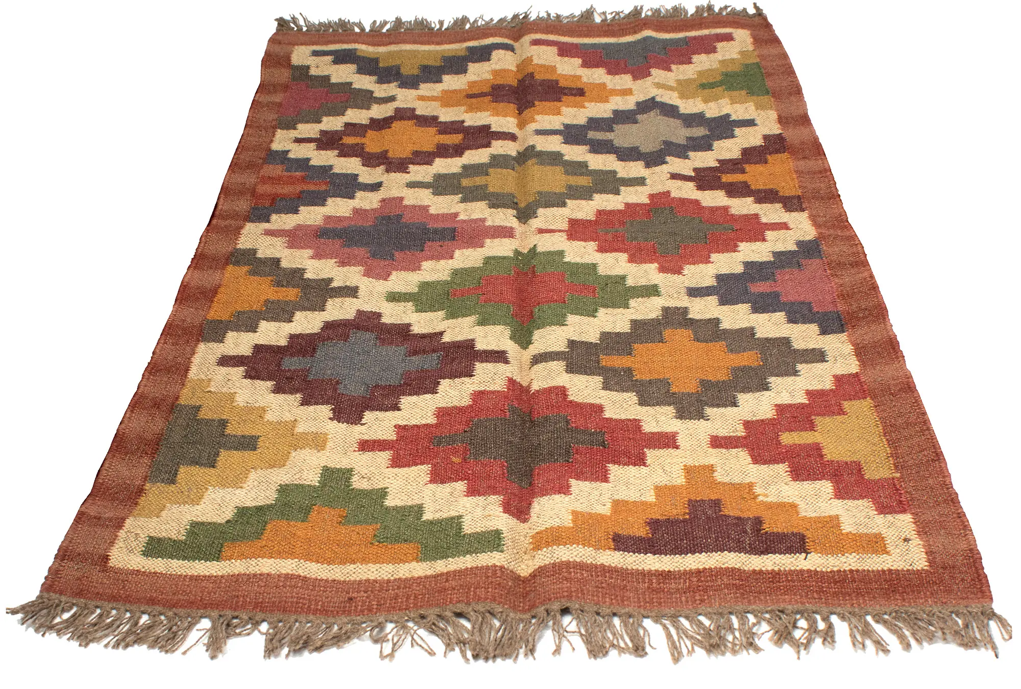 Quadrilateral motifs in a plethora of pastels, each distinct from the other, makes for an abstract piece of art. Indeed this dhurrie from the Exotic India collection doubles as a unique artwork, so precise is the handiwork that has gone into finishing it. Dense tassels grace the edges as is characteristic of Indian dhurries, and a smooth brown border seemingly contains the vivid motifs, which renders it a balanced composition.