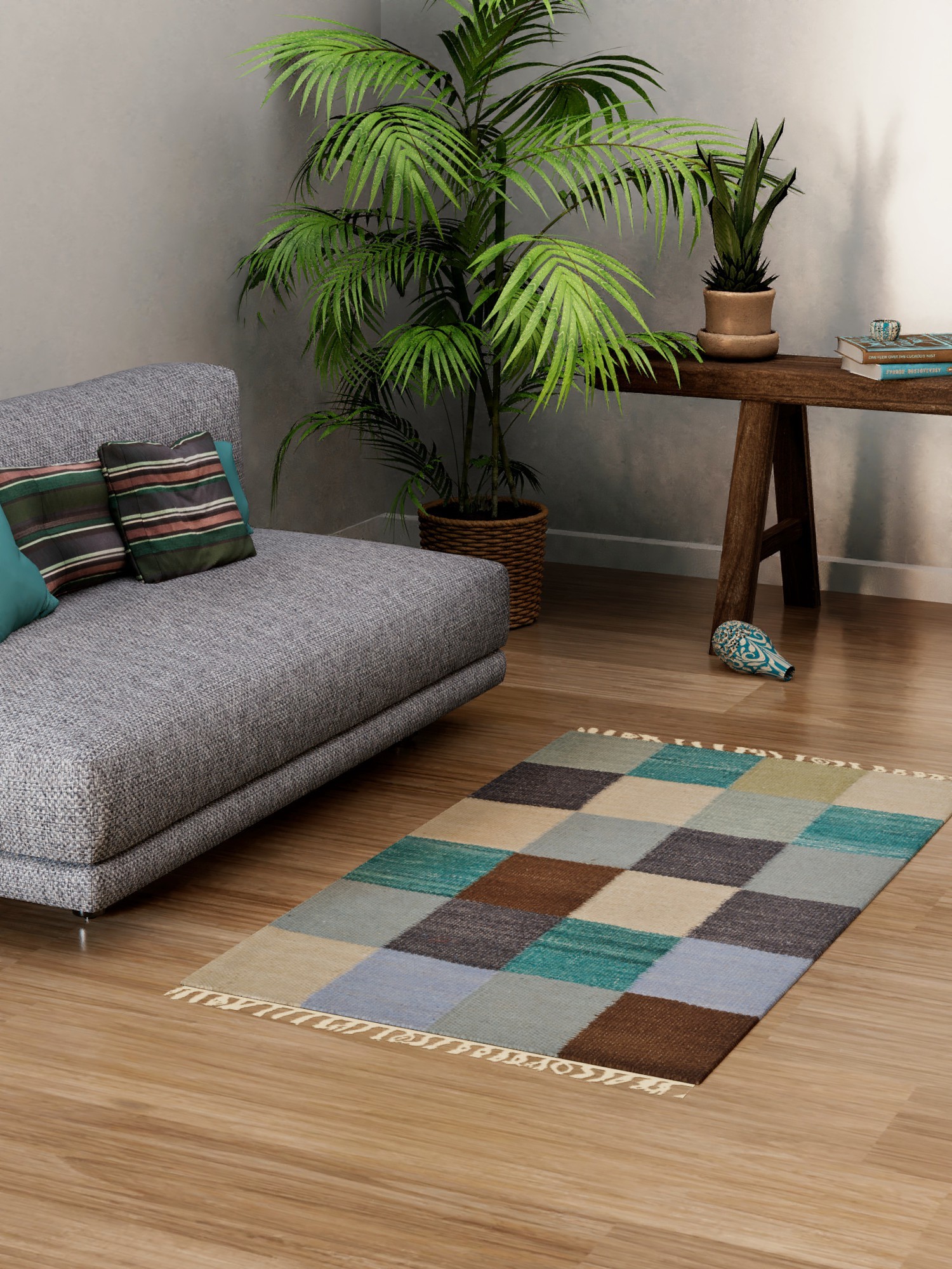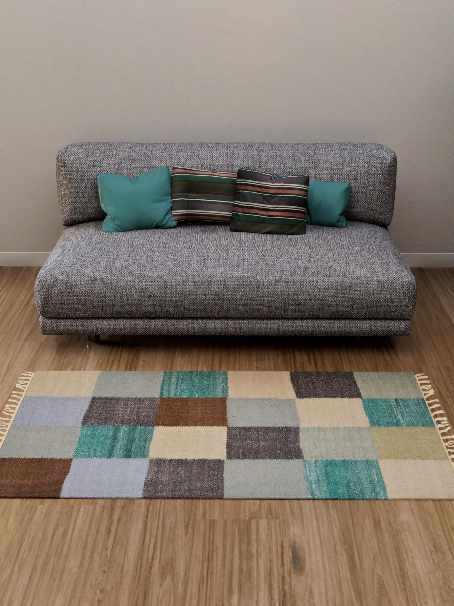 The geometric checks design displays a visually appealing composition. A carefully chosen palette of colors creates a harmonious blend, offering a subtle yet sophisticated statement for your floors. The interplay of earthy tones, cool blues, and calming greens create a cozy and inviting atmosphere. The thoughtful arrangement of colors not only adds visual interest but also complements a variety of interior design styles, from rustic and bohemian to contemporary and minimalist.