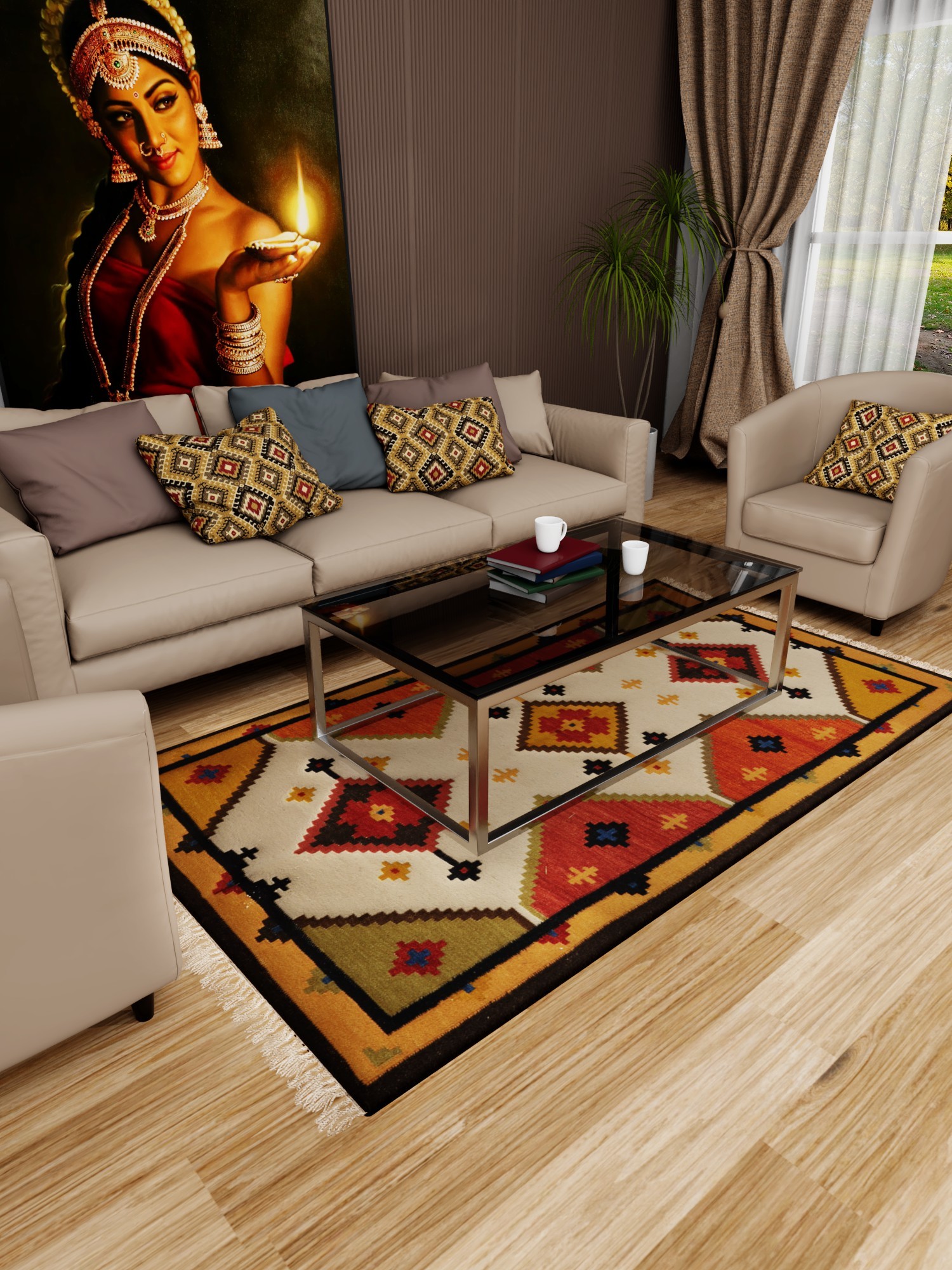 To maintain the beauty and longevity of your handloom dhurrie, regular vacuuming is recommended. For spills or stains, blot gently with a clean, damp cloth and mild detergent. Professional cleaning is recommended for more extensive cleaning needs. With proper care, this treasured piece will continue to enrich your home for generations to come.