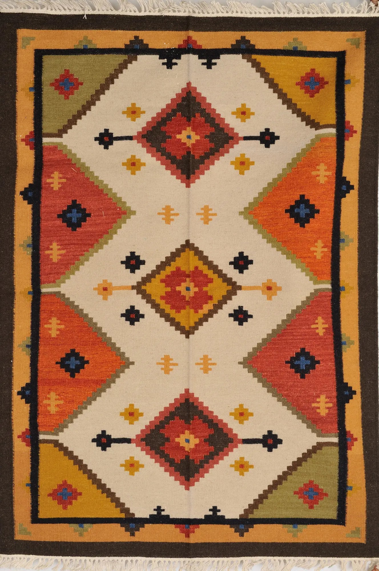 This dhurrie features a captivating zigzag motif that lends a dynamic and visually appealing element to any space. The vibrant color palette blends earthy tones with pops of brighter hues, creating a harmonious balance that complements a variety of interior styles. The central field is a gentle off-white, allowing the geometric patterns to truly stand out. The colors in the patterns range from deep blues to vibrant reds, sunny yellows to earthy browns, and even a few touches of green, creating a diverse and eye-catching design. The design is framed by a band of color that adds to the cohesive, finished look. The inclusion of tassels along the ends gives it a charming, traditional feel, adding to its overall aesthetic appeal.