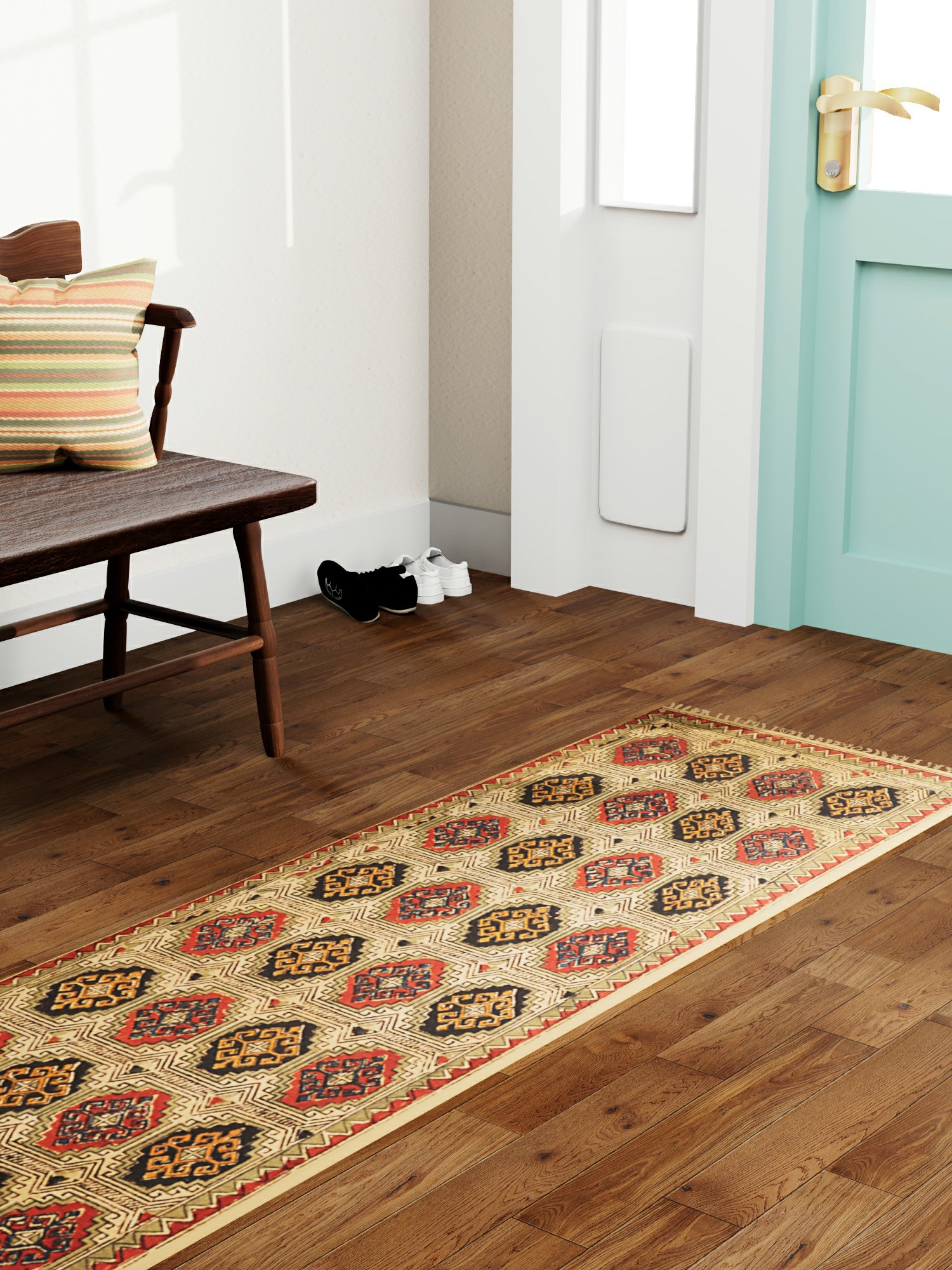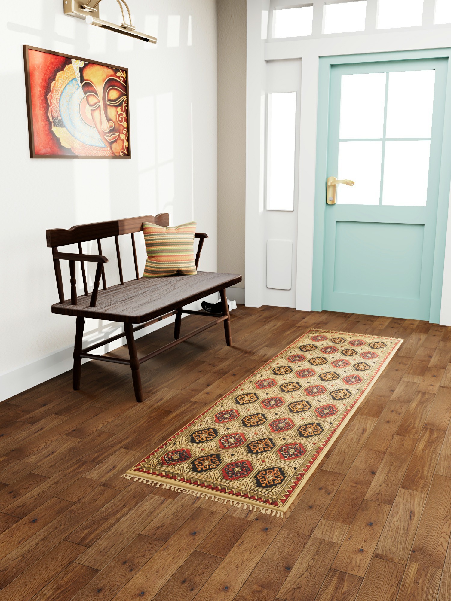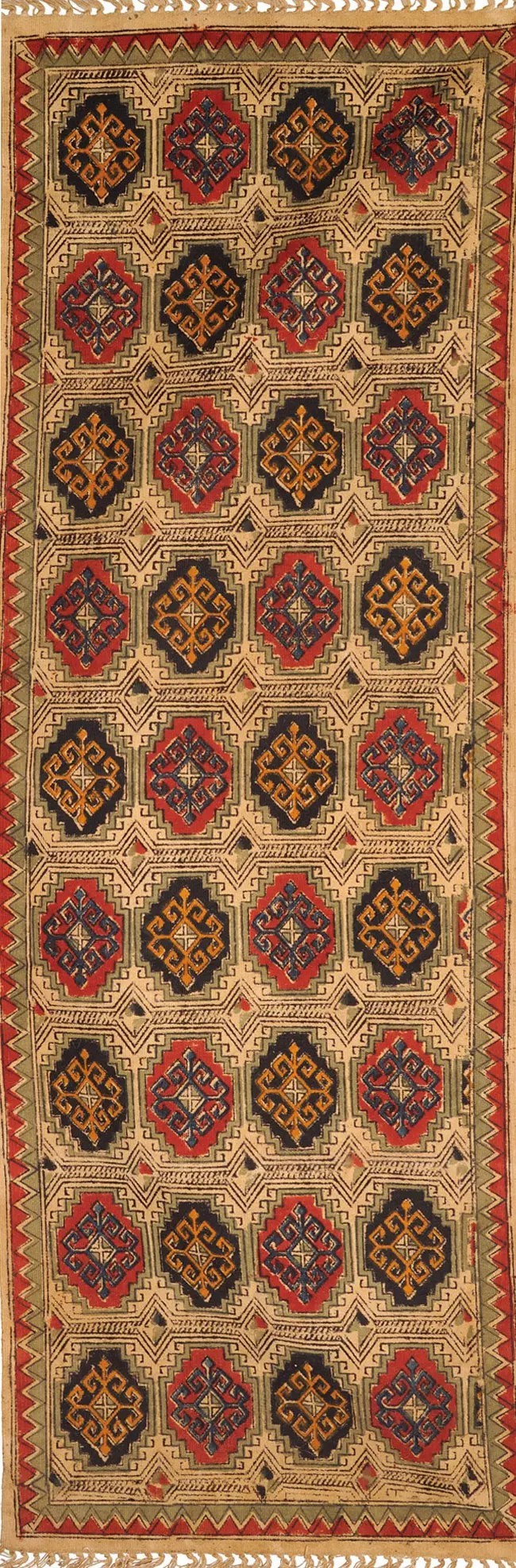 Immerse yourself in the ancient art of Kalamkari with this stunning runner. Originating from Telangana, India, Kalamkari is a centuries-old technique of hand-painting or block-printing on cotton fabric. This piece showcases the intricate artistry passed down through generations of skilled artisans. It is more than just a floor covering; it’s a tangible connection to a rich cultural heritage, bringing stories and traditions into your home.