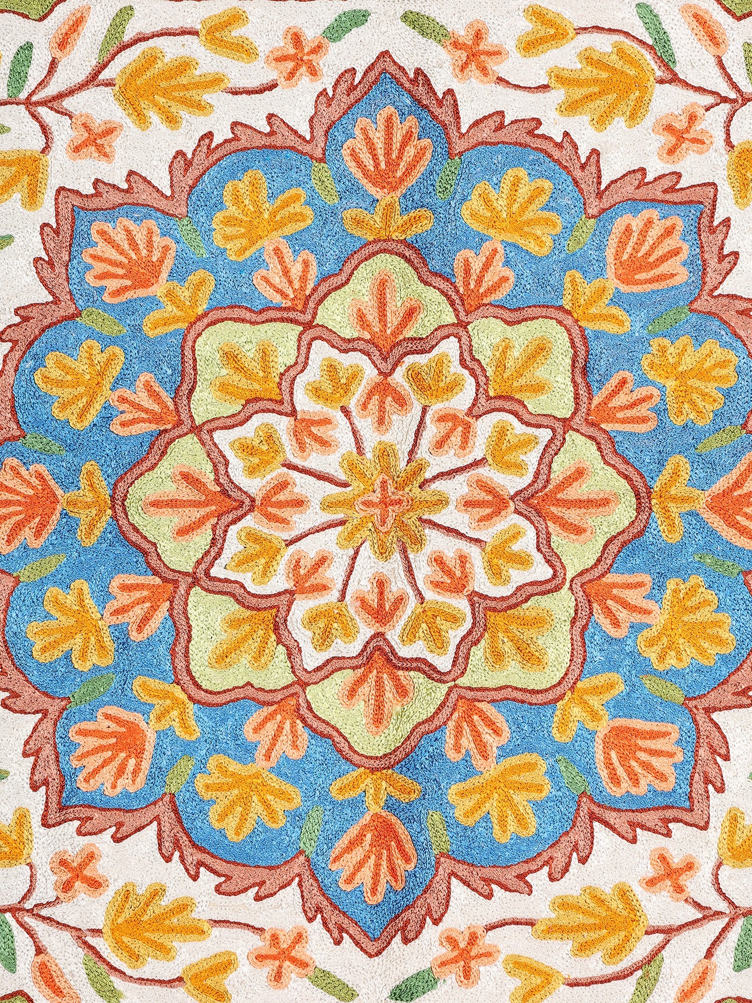 The design of this rug is a celebration of nature's beauty, featuring an all-over pattern of intricately embroidered flowers. The central medallion, a captivating floral bloom, draws the eye with its vibrant blues and yellows, surrounded by delicate petals in soft oranges and greens. This central motif is framed by a scalloped border, creating a sense of depth and movement. Beyond this, the rug is adorned with further floral elements and stylized leaves, scattered across a creamy white canvas. The delicate interplay of colors – soothing blues, cheerful yellows, warm oranges, and fresh greens – evokes the lush landscapes and blooming gardens of the Kashmir valley.