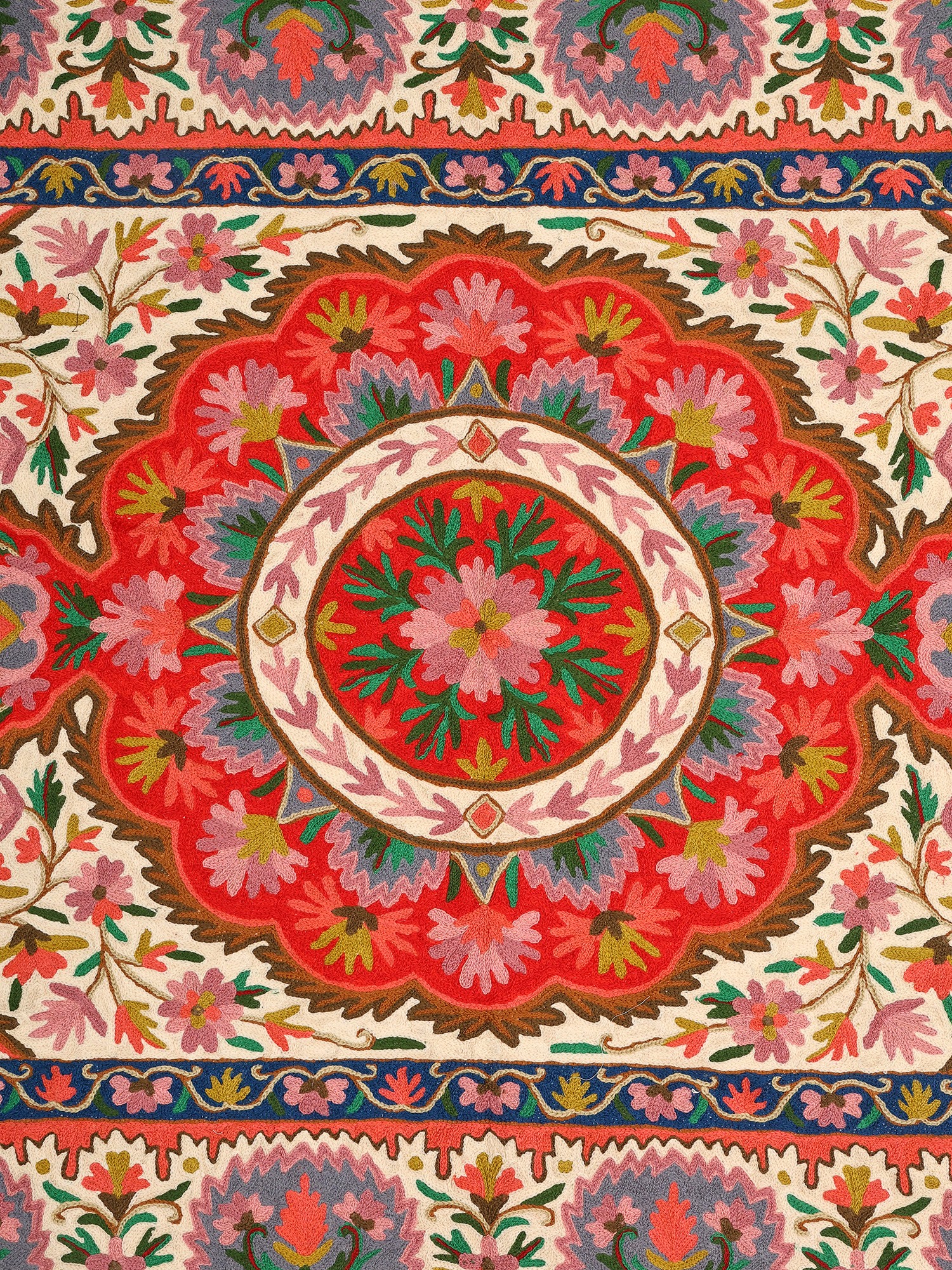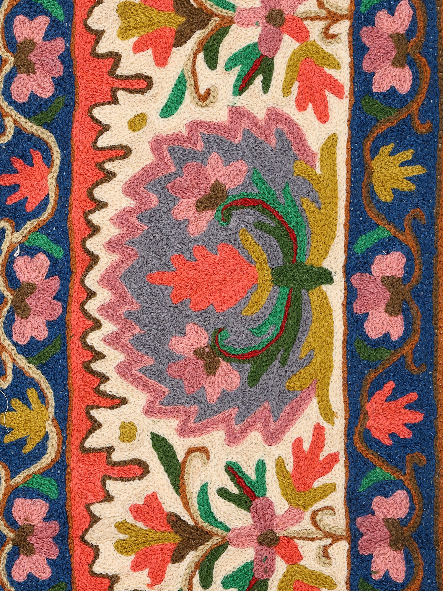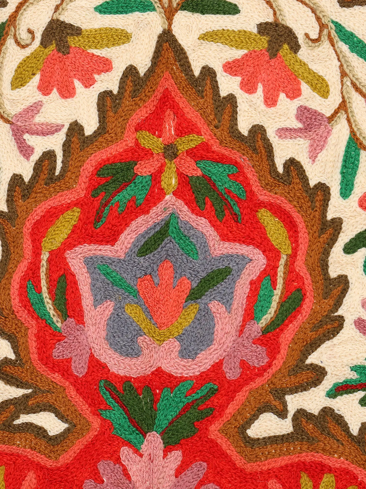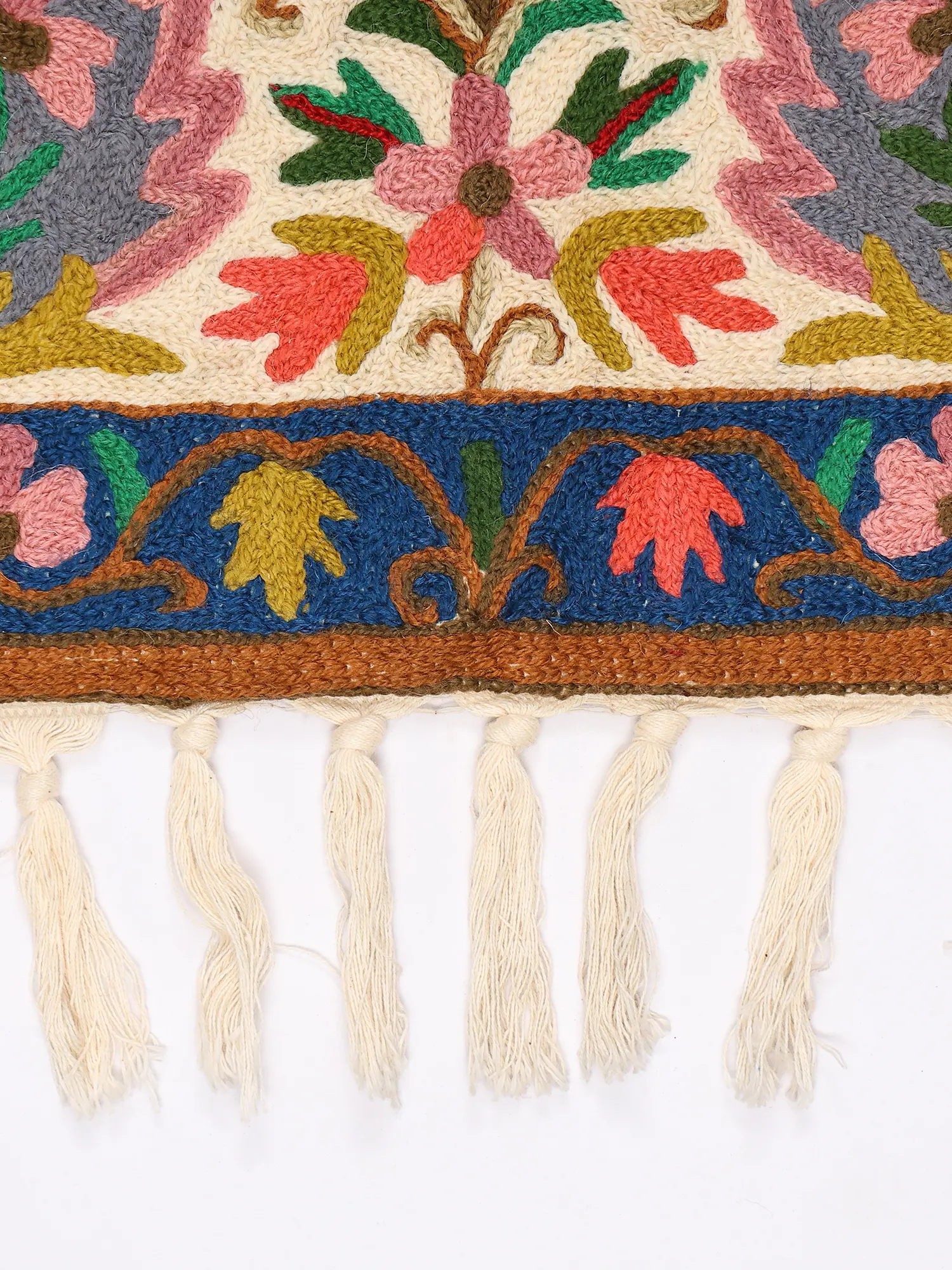 Off-White Chain Stitched Kashmiri Carpet with Floral Silk Threadwork