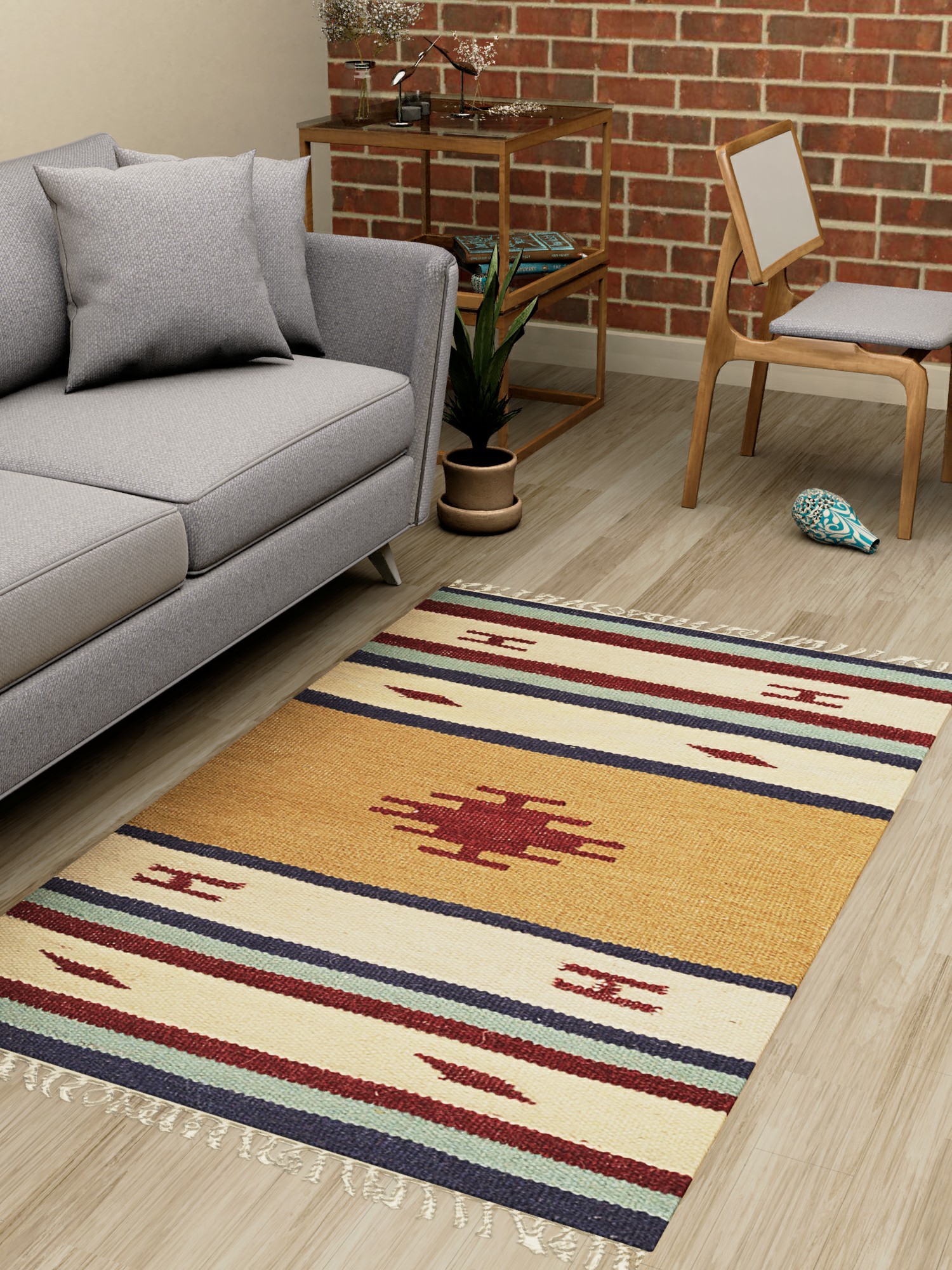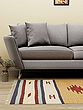 This dhurrie is a vibrant expression of color and design. The intricate patterns, rendered in a palette of earthy tones and bold accents, create a captivating visual tapestry. The combination of stripes and geometric motifs adds a touch of sophistication and visual interest. The playful tassels along the edges lend a charming, handcrafted feel, making it a delightful addition to any decor. Whether your style is bohemian, contemporary, or eclectic, this dhurrie effortlessly complements a wide range of interior aesthetics.