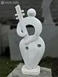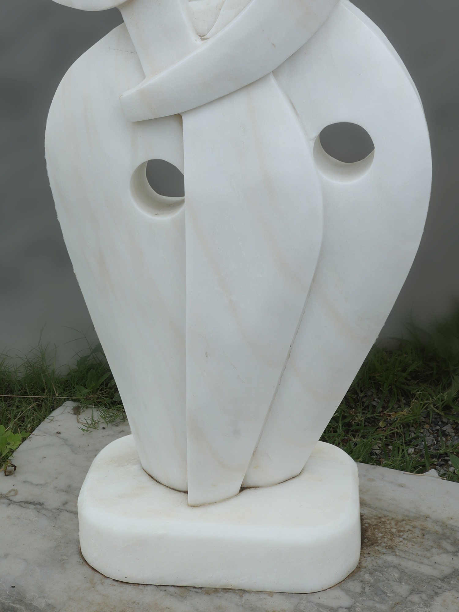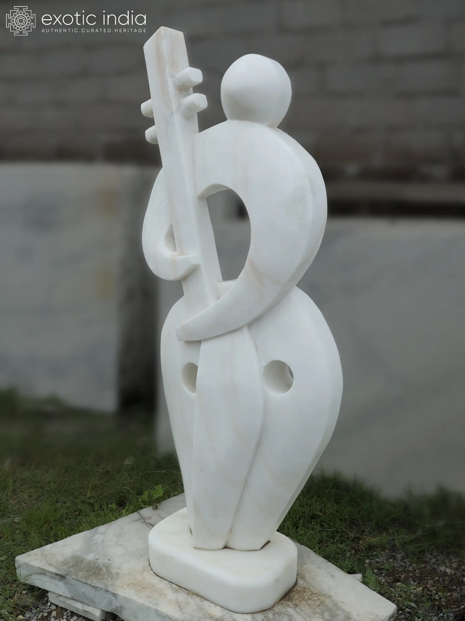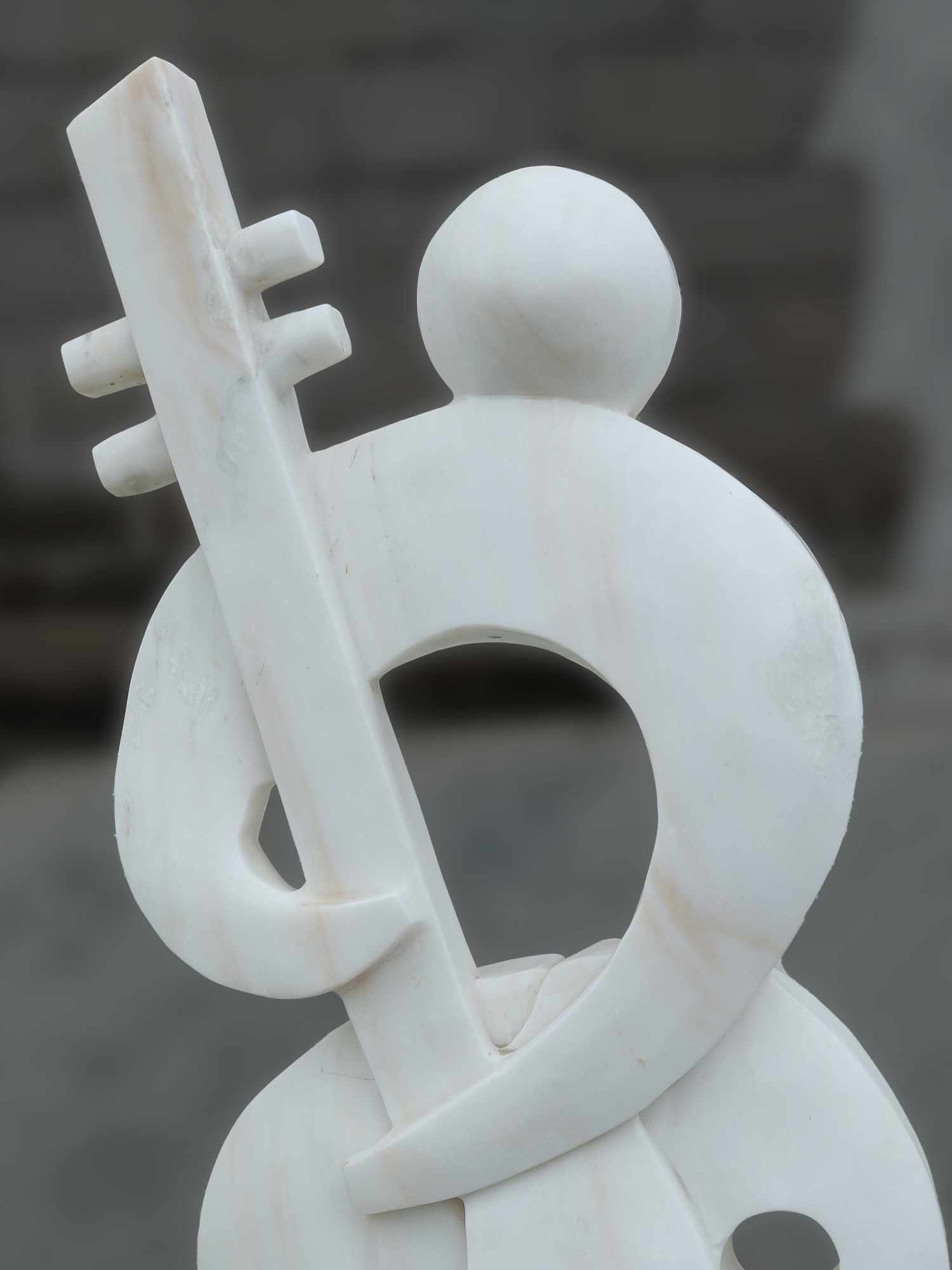 Carved in luminous white marble, this modern sculpture blurs the boundary between the player and the played, between form and resonance.