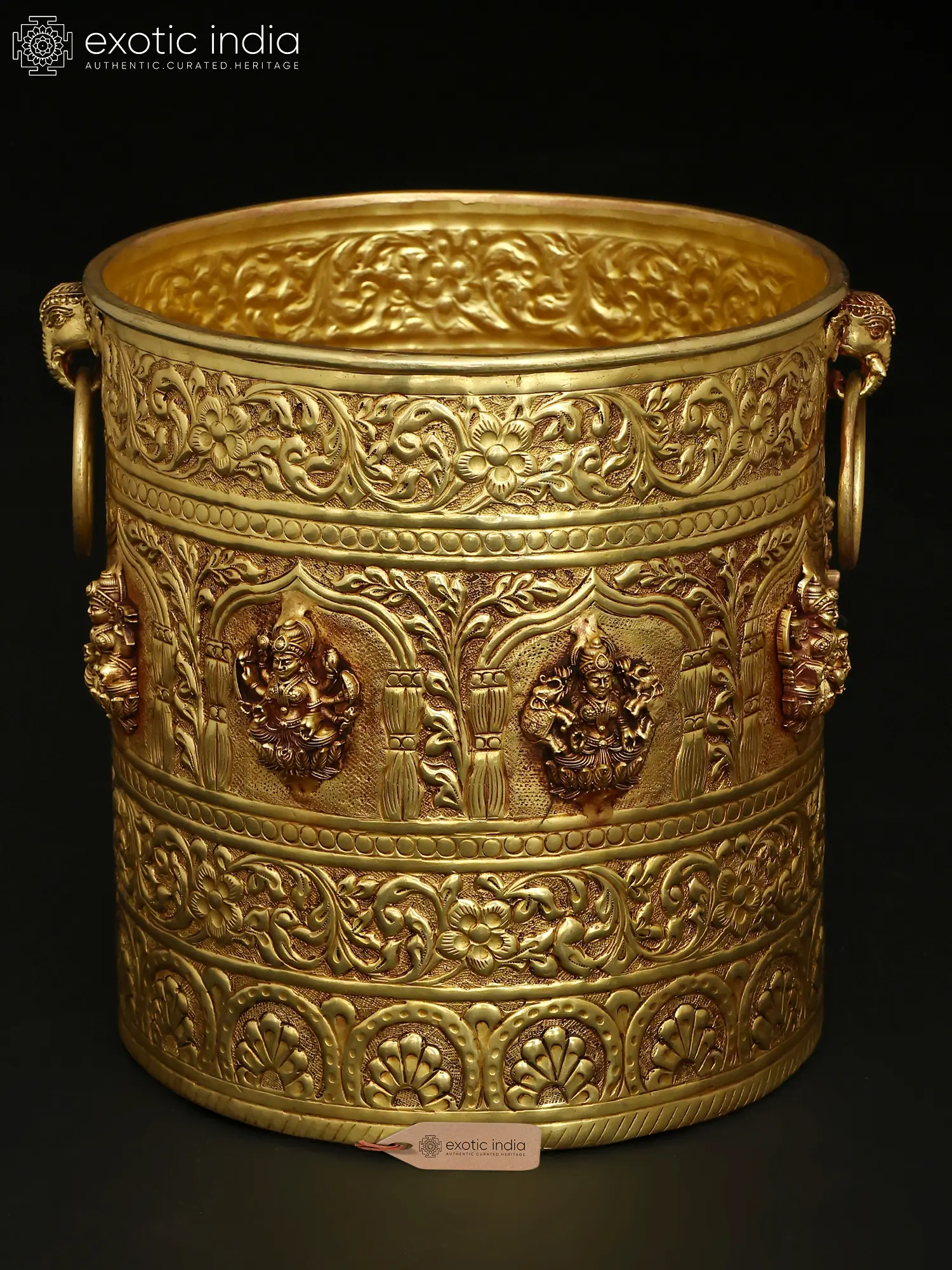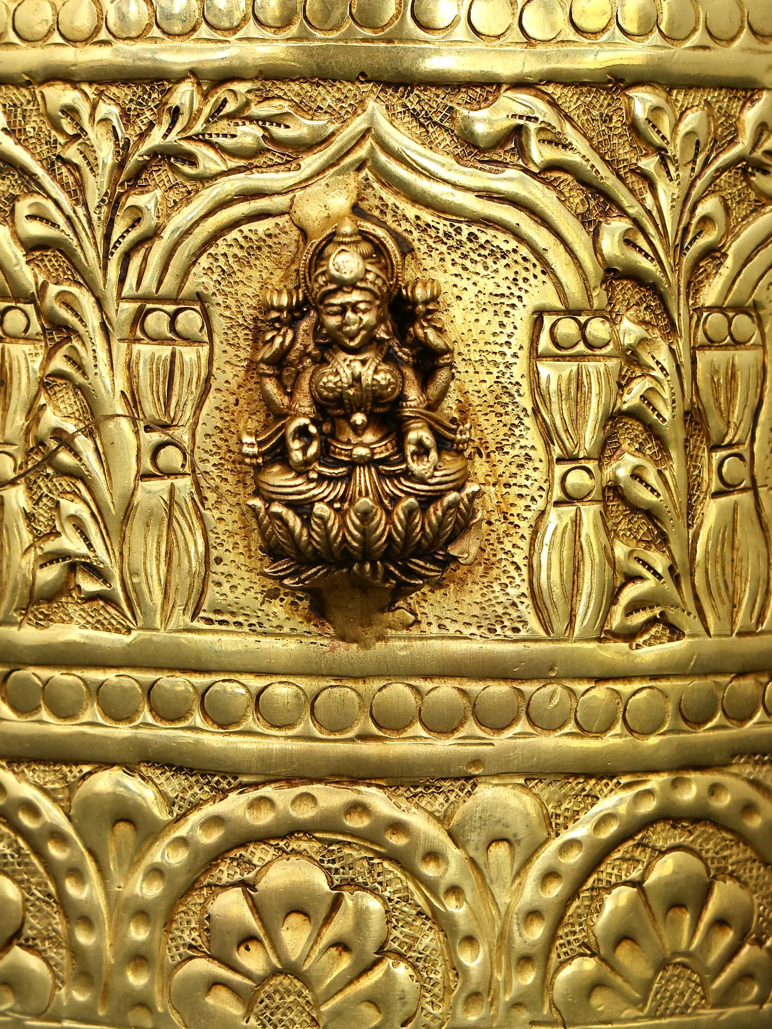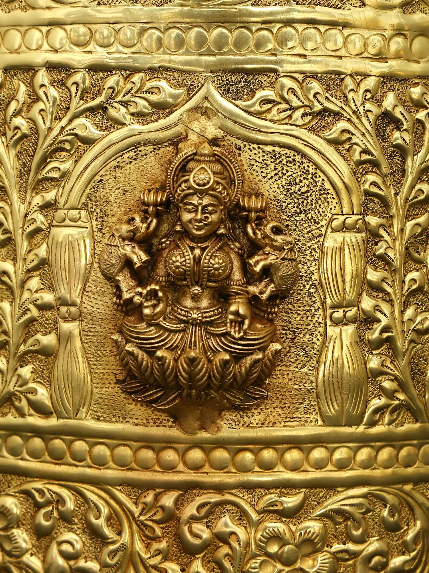 Features intricate embossed depictions of Ashtalakshmi, the eight forms of the Hindu goddess Lakshmi, symbolizing wealth and prosperity.