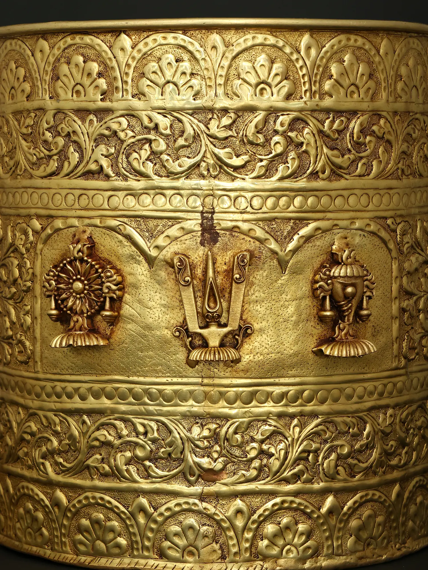 Crafted from durable and lustrous brass, showcasing intricate embossed detailing.