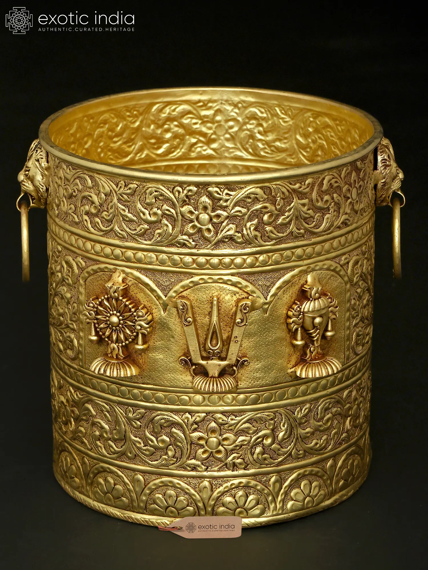 The surface is adorned with a symphony of deeply embossed motifs, creating a mesmerizing interplay of light and shadow that accentuates its sculptural form. The central panel prominently features the Vaishnav Tilak, flanked by the auspicious Shankh (conch shell) and Chakra (discus), symbols deeply revered in Hindu tradition. A decorative band of ornate floral scrollwork encircles the entire piece, with lion heads and rings adorning the upper rim, adding a regal touch. Measuring a commanding 10 inches in height and 10.5 inches in width and length, it offers a generous capacity for your botanical arrangements.