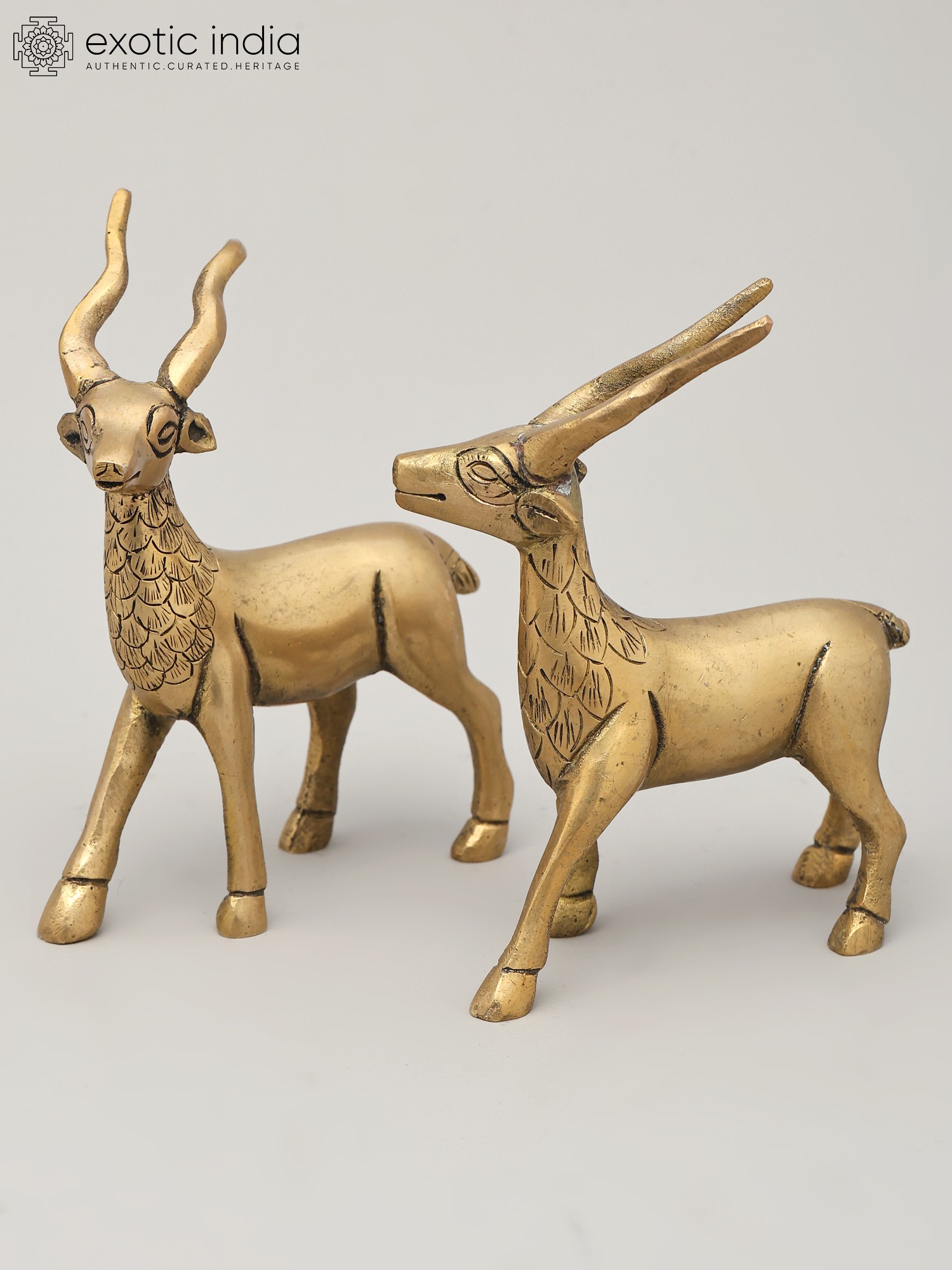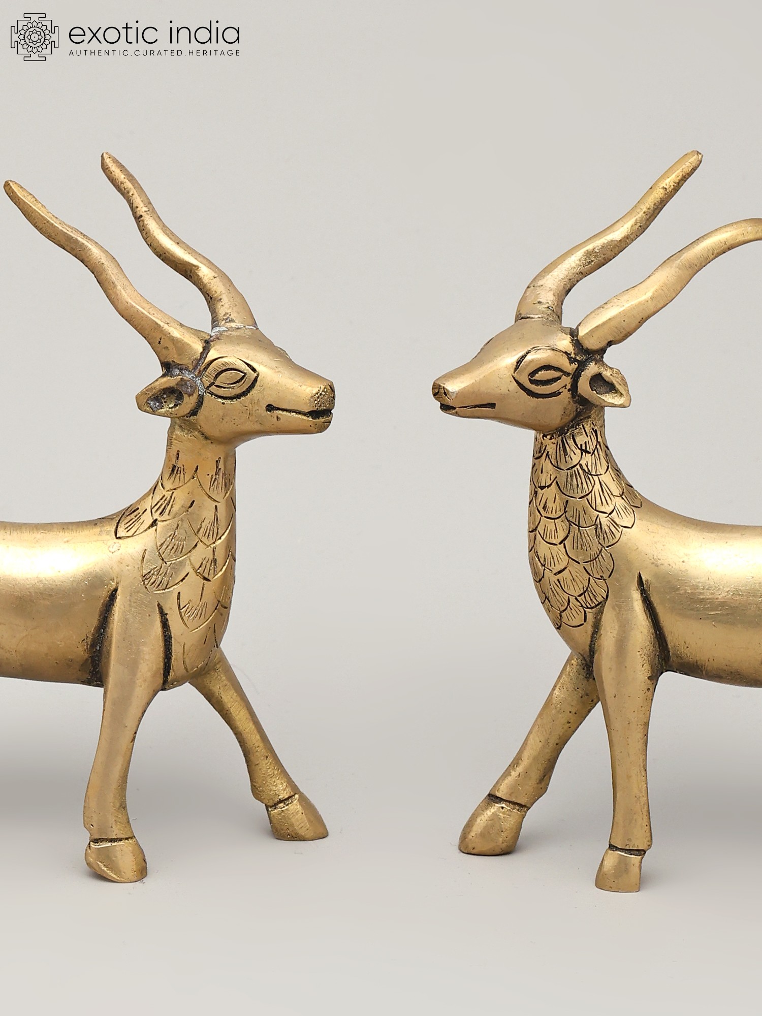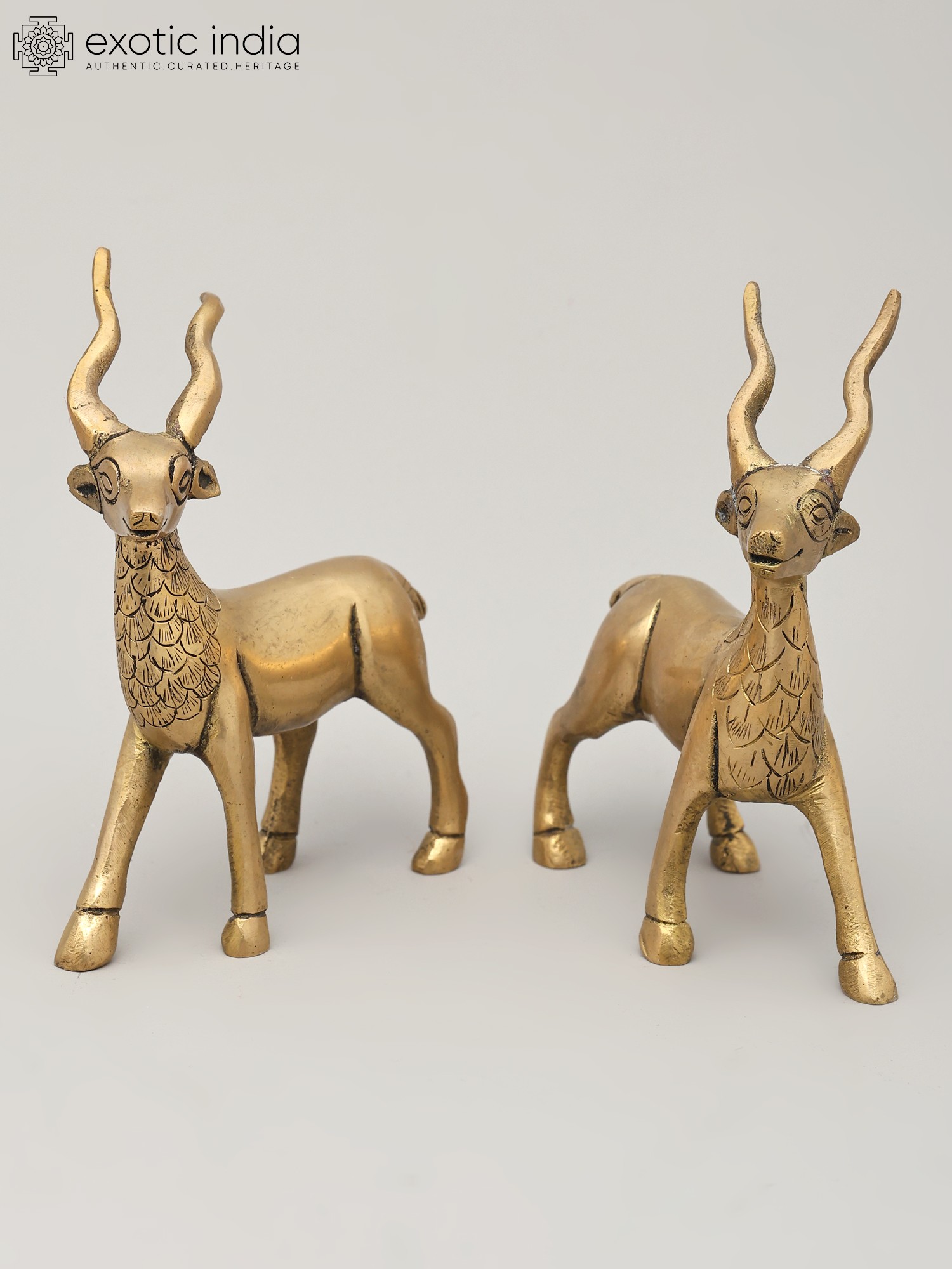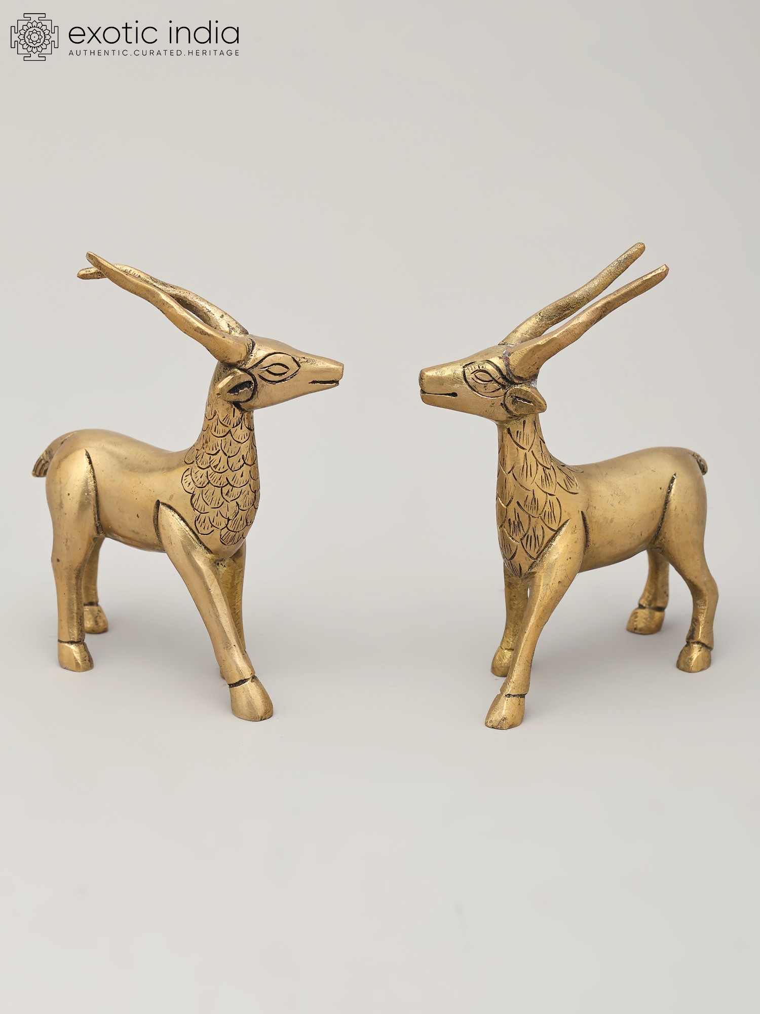 This Pair of Deer Figurines, crafted from brass, exudes timeless elegance and artistic charm. Though referred to as deer, the figures are actually of graceful Antelopes, captured in exquisite detail. The brass material lends a luxurious sheen to the figurines, enhancing their aesthetic appeal. Each curve and contour of the antelopes' bodies is meticulously rendered, imbuing the figurines with lifelike grace and beauty.