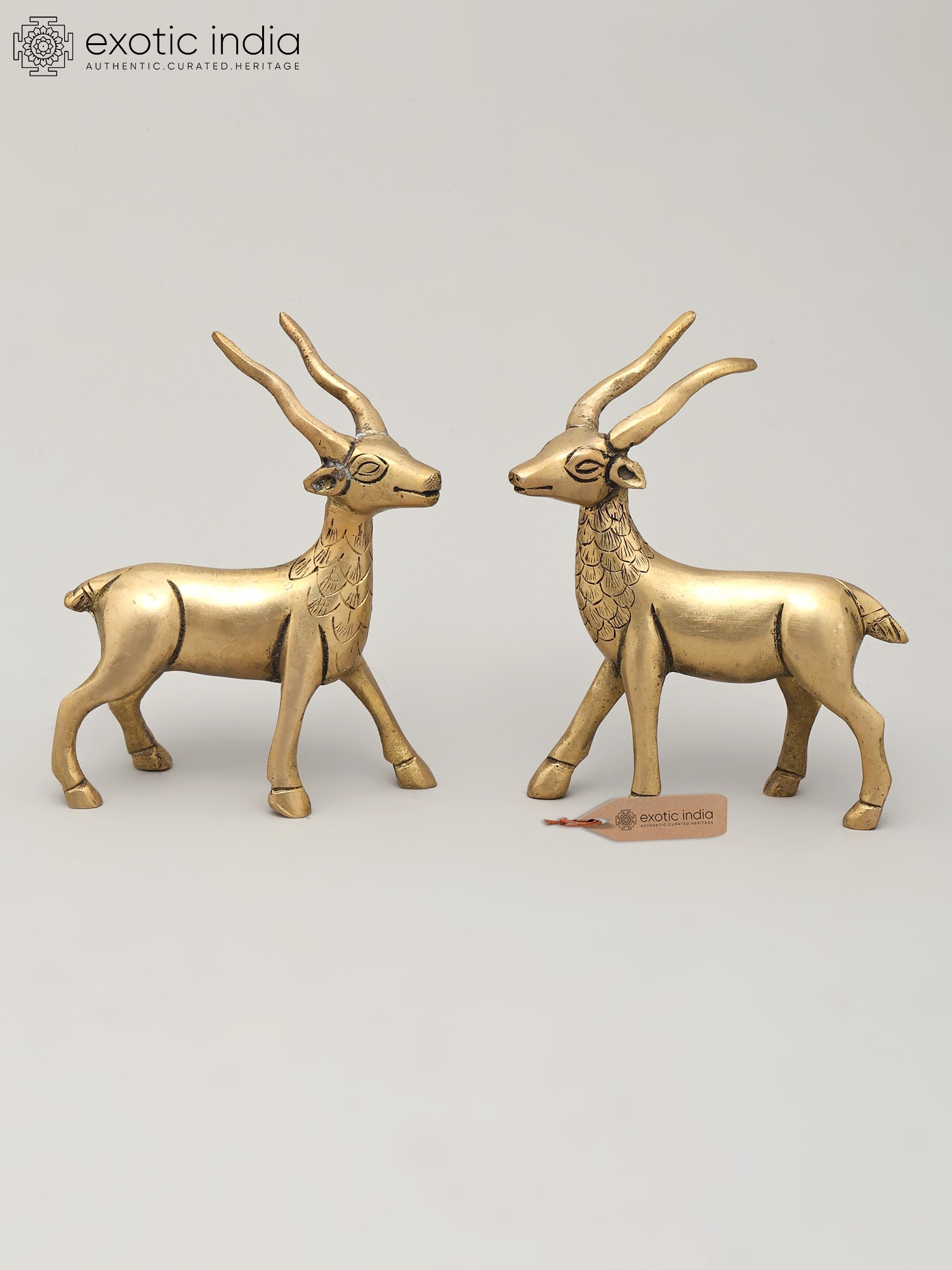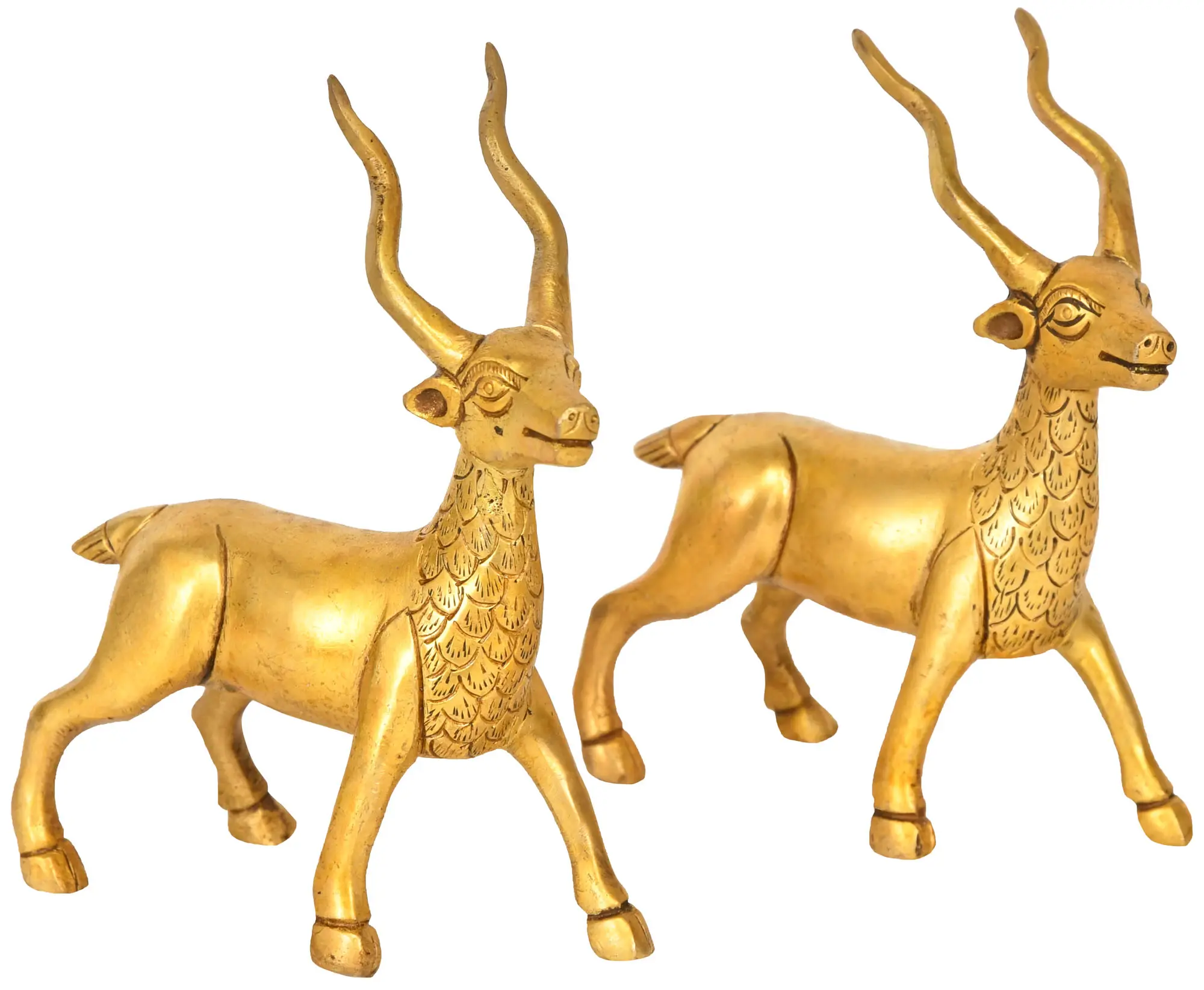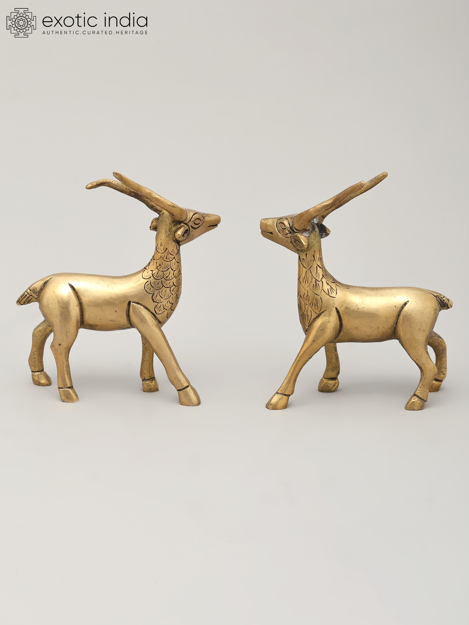 This Pair of Deer Figurines, crafted from brass, exudes timeless elegance and artistic charm. Though referred to as deer, the figures are actually of graceful Antelopes, captured in exquisite detail. The brass material lends a luxurious sheen to the figurines, enhancing their aesthetic appeal. Each curve and contour of the antelopes' bodies is meticulously rendered, imbuing the figurines with lifelike grace and beauty.