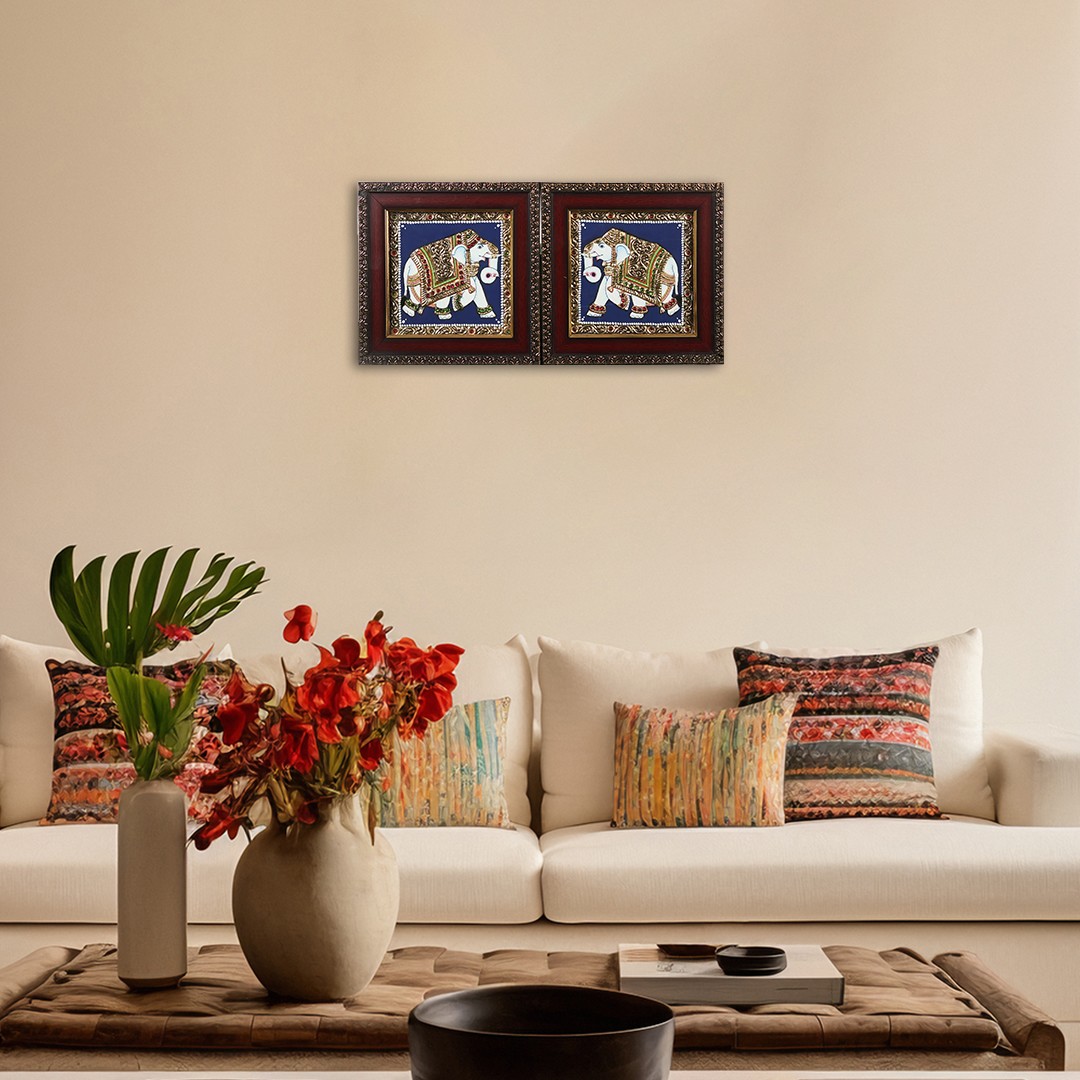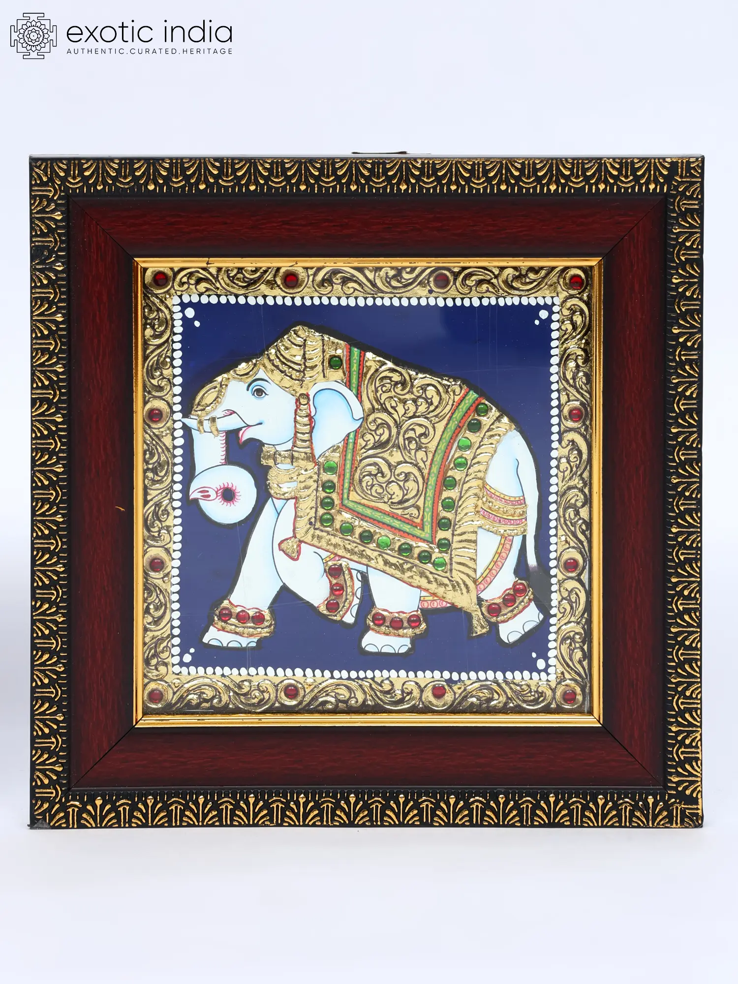 Since the Vedic era, the Gaja, or elephant, has been connected with qualities like as honour, victory, and peace. The white elephant Airavat is Lord Indra's vehicle and represents prosperity and harmony. The use of gold foil embellishments in this Tanjore painting provides a touch of grandeur and underlines the holy aura and auspiciousness connected with elephants in Indian tradition. The presence of elephants in this painting exudes strength, stability, and prosperity. The finely crafted wooden frame adds another level of opulence to the picture, making it ideal for living room decor.