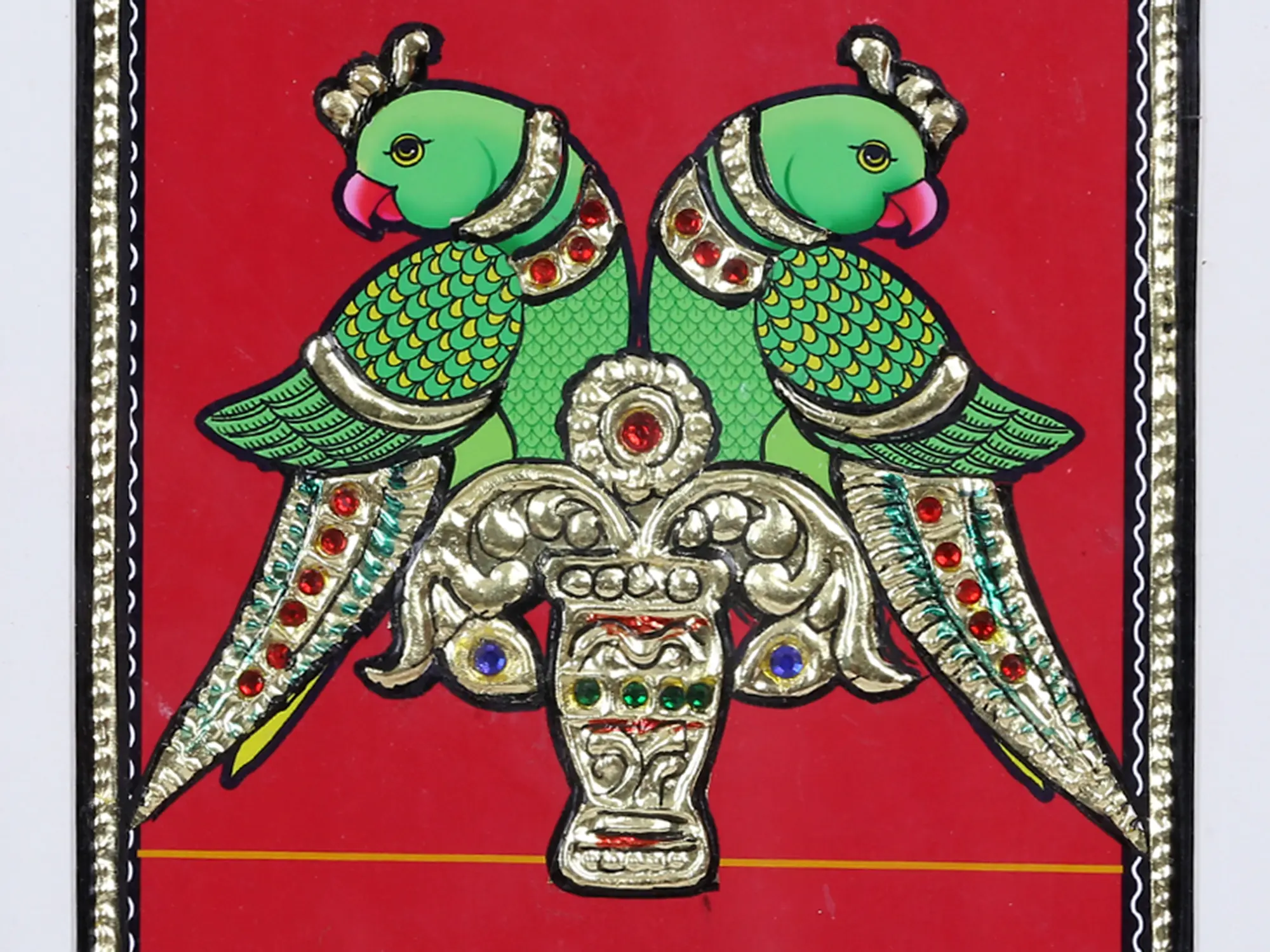 Elevate your home decor with this exquisite piece of traditional Indian art. Crafted with meticulous attention to detail, this artwork captures the vibrant spirit of parrots, a symbol of love and devotion, rendered in the classical Tanjore style. The rich red background provides a striking contrast to the luminous green of the birds, drawing the viewer into their captivating gaze. Each feather is delicately depicted, adorned with intricate patterns that speak of generations of artistic mastery.