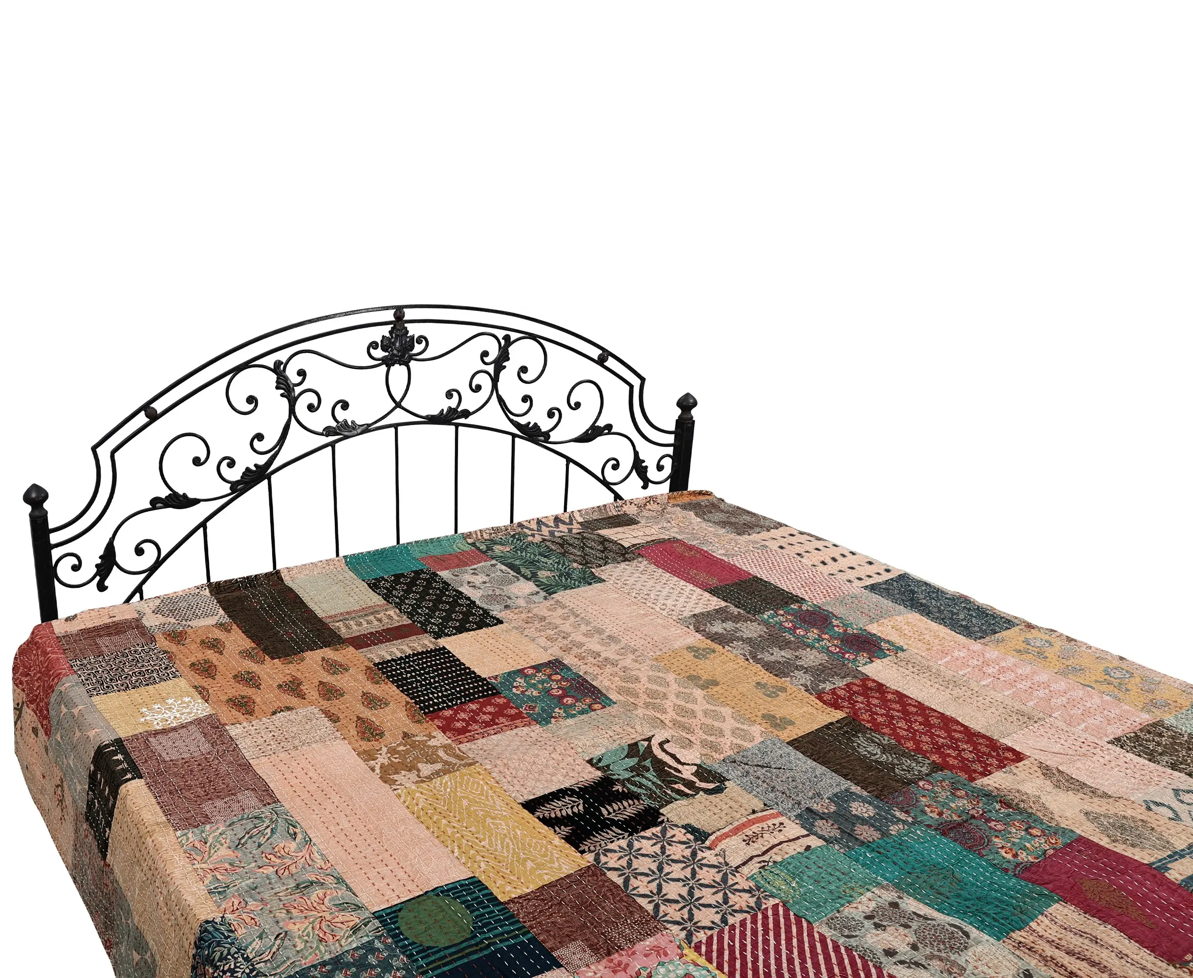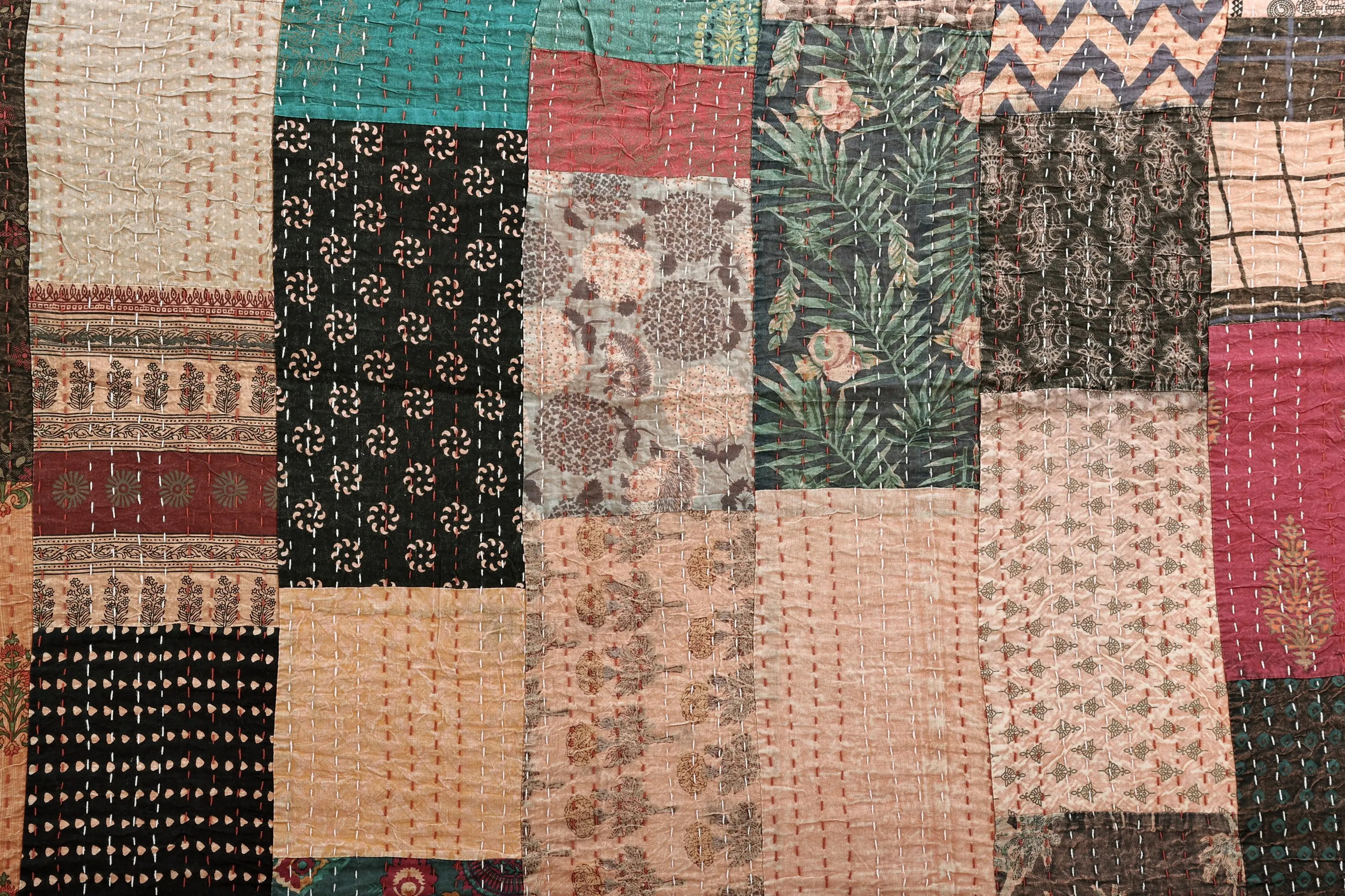This bedcover is a conversation starter, a statement piece that reflects your appreciation for handcrafted artistry and global design. It's perfect for adding a touch of bohemian flair to a modern space or complementing the cozy ambiance of a traditional bedroom. Beyond its aesthetic appeal, this bedcover offers a practical and versatile bedding solution. Its generous size ensures ample coverage, while its lightweight cotton construction makes it suitable for year-round use. Whether you're seeking a cozy layer for chilly nights or a stylish accent for warmer months, this Kantha embroidered bedcover is sure to impress. The bedcover’s character is that it is made of patches. These patches have different colors and prints that have been used in a manner to give an overall pleasant feeling to the beholder. This makes it a truly unique design to be enjoyed.