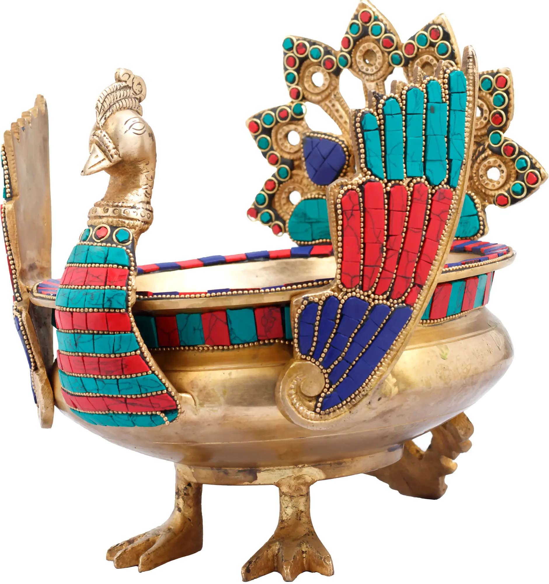 The rich, golden hue of the brass forms the foundation of this piece, exuding a sense of warmth and luxury. The surface is adorned with meticulously placed colored stones, creating a striking visual contrast that accentuates the intricate detailing. The peacock motif, a symbol of beauty, grace, and prosperity, is rendered with remarkable precision, capturing the essence of this majestic bird. The color combination is vibrant and eye-catching, lending an aura of regal charm. The overall design showcases a harmonious blend of form and function, making it both aesthetically pleasing and practical.