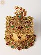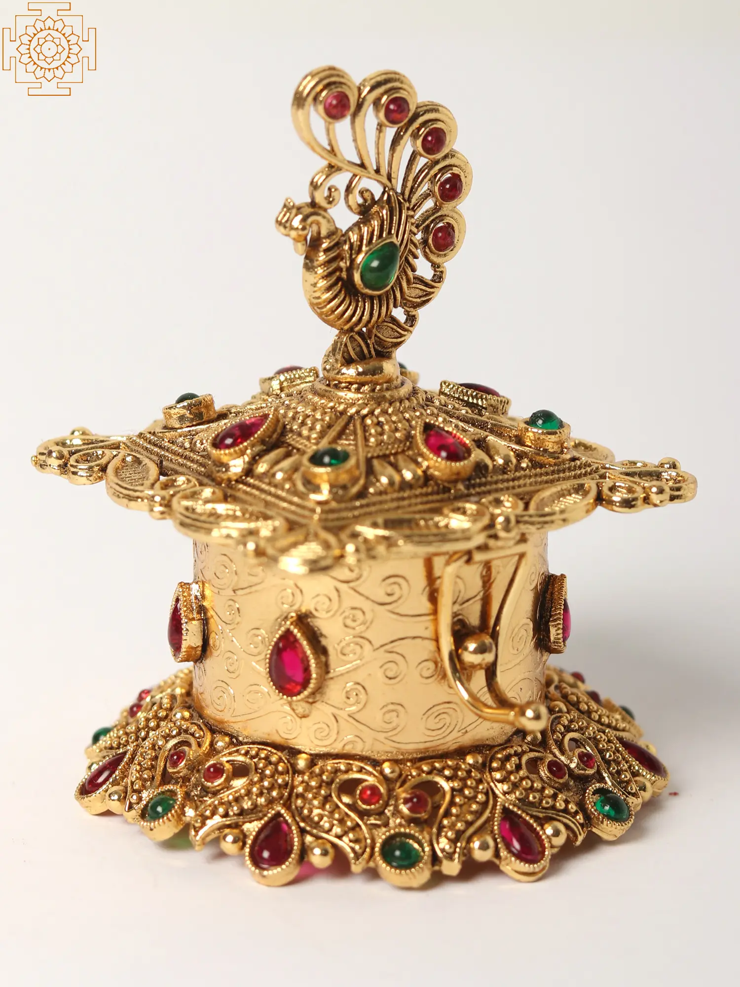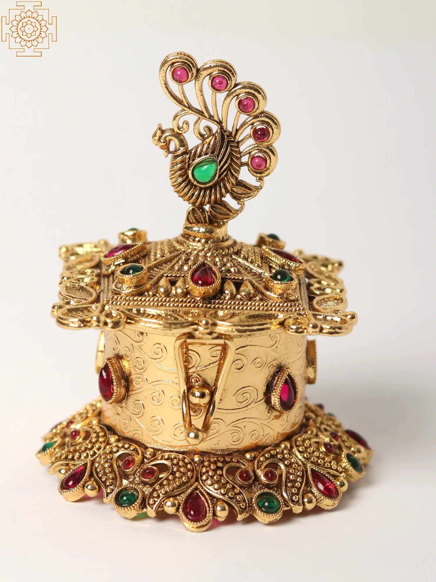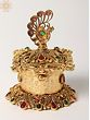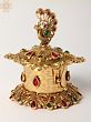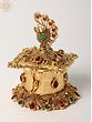 Elevate your home décor and add a touch of regal elegance with this stunning Peacock Design Brass Sindoor Box. Meticulously crafted with intricate detailing and vibrant gemstone accents, this piece is more than just a container; it's a work of art that embodies rich cultural heritage and sophisticated style. The box's ornate design, featuring a majestic peacock perched atop, is sure to captivate all who see it. The rich gold brass finish beautifully complements the embedded multicolored stones, creating a dazzling display of color and craftsmanship.