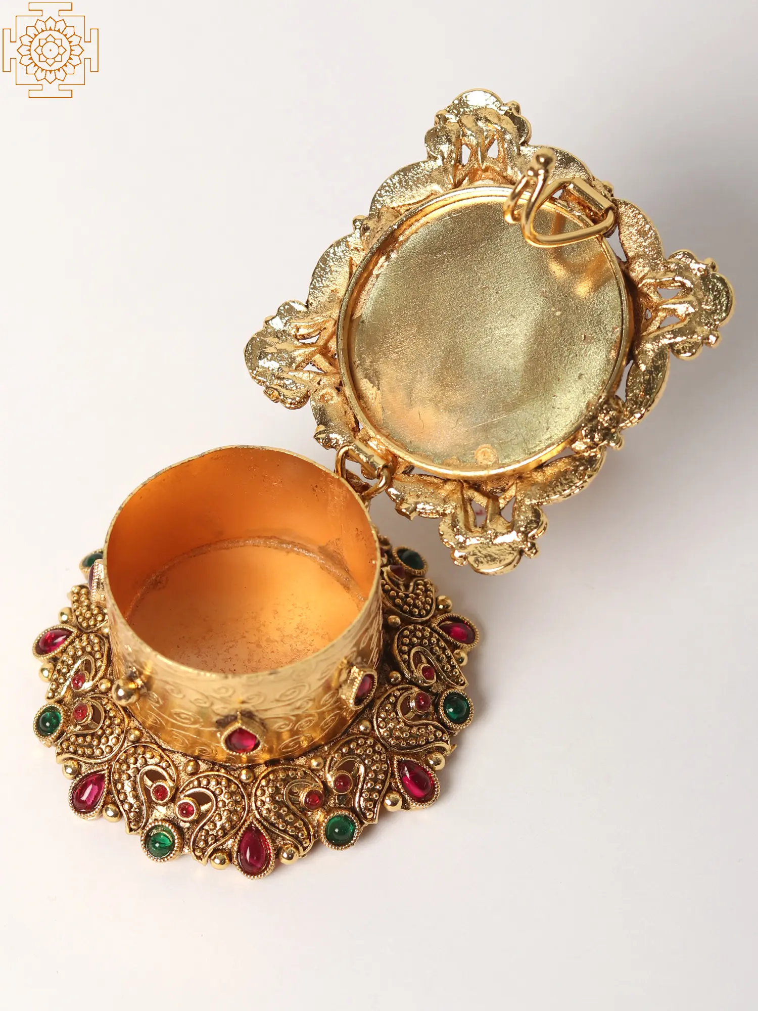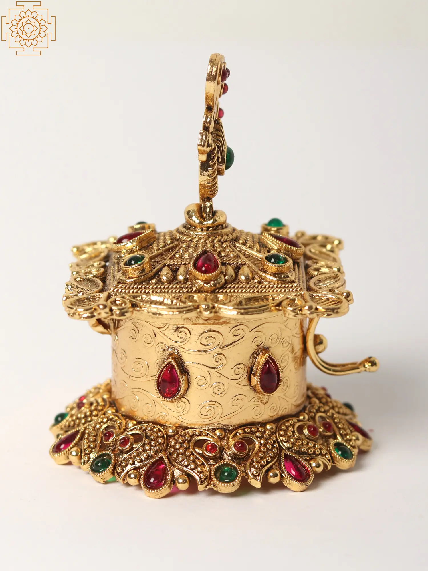 Crafted from high-quality brass, this sindoor box is built to last. The durable material ensures that this heirloom-quality piece will remain a treasured possession for years to come. The vibrant multicolored stones, carefully inlaid, add a touch of sparkle and shine, making this piece an eye-catching focal point in any room. The intricate patterns etched into the brass enhance the box’s luxurious appearance, demonstrating superior attention to detail. Its compact size makes it perfect for placement on a vanity, dressing table, or altar.