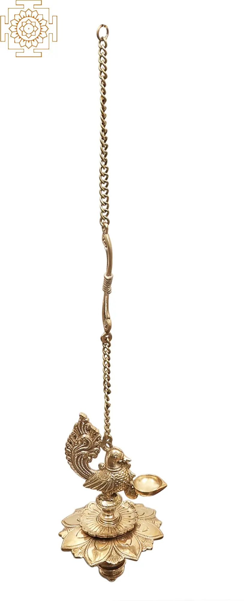 This magnificent brass lamp in the Hoysala Art style with a center picture of a peacock biting a branch indicates progress and fortune, both of which are associated with the peacock. The sculpture's only source of illumination is a lamp attached to the peacock's neck. The presence of knowledge is symbolized by an inverted lotus at the bottom. This lamp is frequently burnt in temples during festivals and is also used as a decorative piece. Diya, a significant ceremonial object, is imbued with the auspicious image of a peacock and used as a channel to bring good fortune and prosperity to a home.