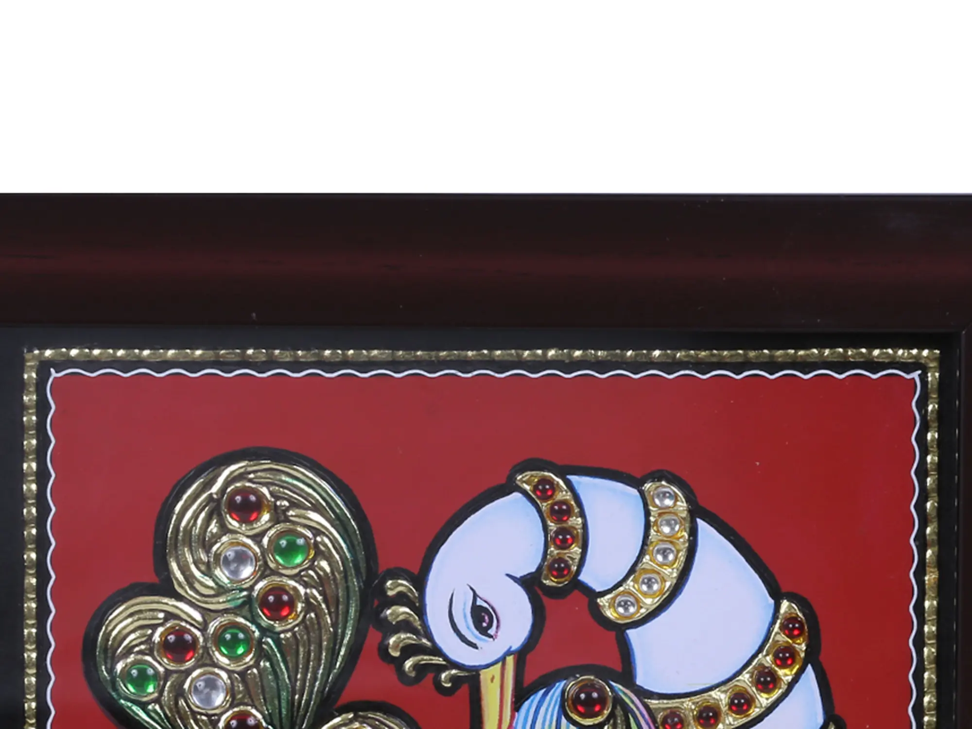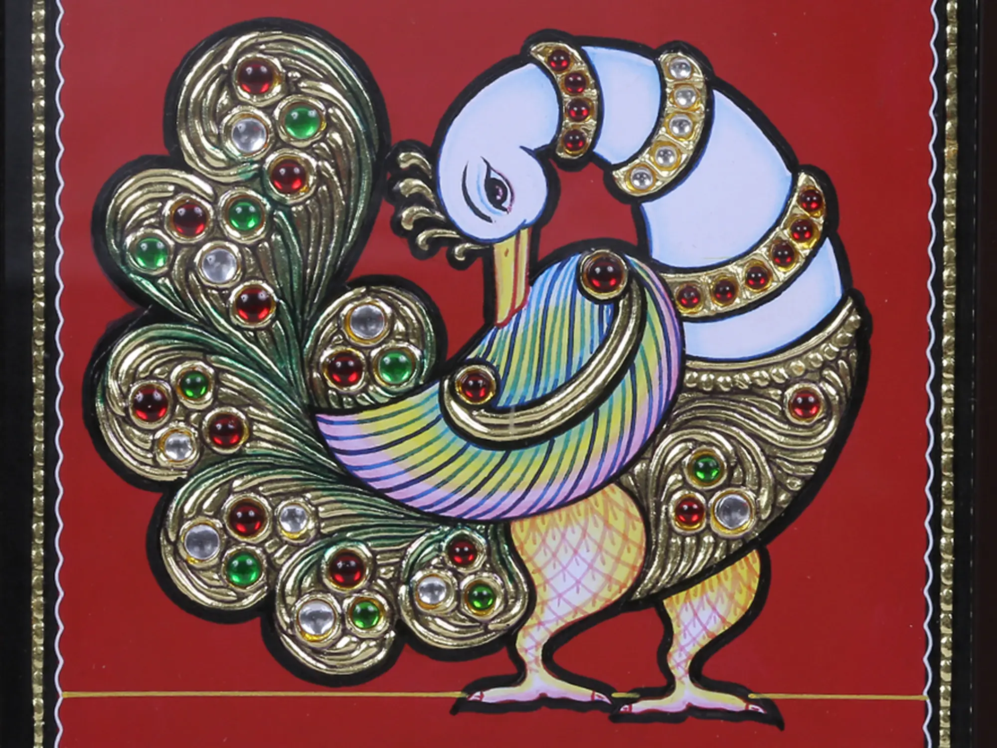 This key hanger is a testament to the enduring beauty of Tanjore art. Originating in the Tanjore district of Tamil Nadu, India, this style is characterized by its use of natural pigments, 24-karat gold foil, and precious stones. Each piece is meticulously hand-painted by skilled artisans, who dedicate countless hours to creating the intricate details that define this unique art form. The Peacock Key Hanger embodies the spirit of Tanjore art with its rich colors, detailed ornamentation, and shimmering gold accents. The vibrant red background provides a striking contrast to the peacock's plumage, enhancing its visual impact. The use of semi-precious stones adds another layer of richness and texture to the artwork. Owning this piece is like owning a small piece of history, imbued with the passion and skill of generations of artisans.