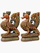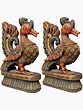 A pair of identically carved and coloured wood-sculptures, brilliant examples of wood carvings used since generations in South Indian temples both as architectural components – structural units or decorative artefacts, as well as parts of the temple imagery, represent peacock, India’s most beautiful dancing bird. Besides representing colours, beauty and music peacock, known to dance fully enthused when the sky bursts with first clouds inspiring the earth to burst with new shoots, and the man’s mind, with hopes and delight, manifests the spirit of India’s culture; and hence, the nation has most appropriately elevated it to the status of the national bird. Exceptionally sensitive to beauty the peacock dances to a sky covered with clouds, in evenings when neither the sun is parching, nor darkness, impenetrable; and preferably in suburbs, neither too far from man’s world nor his world’s rustle and bustle allowed to reach them.