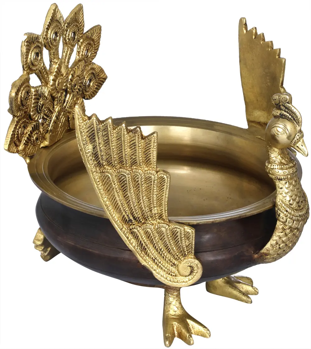 Brass itself is a holy metal and holds an importance in Vastu Shastra as well. This Peacock Urli is an illustration of a bowl placed in between a peacock figure. At the back, beautiful bunch of feathers have been attached and the stand has a shape of the bird's feet; wings attached on both the sides look gorgeous and as an overall view, this one is an artistic craft composed gently and gracefully.