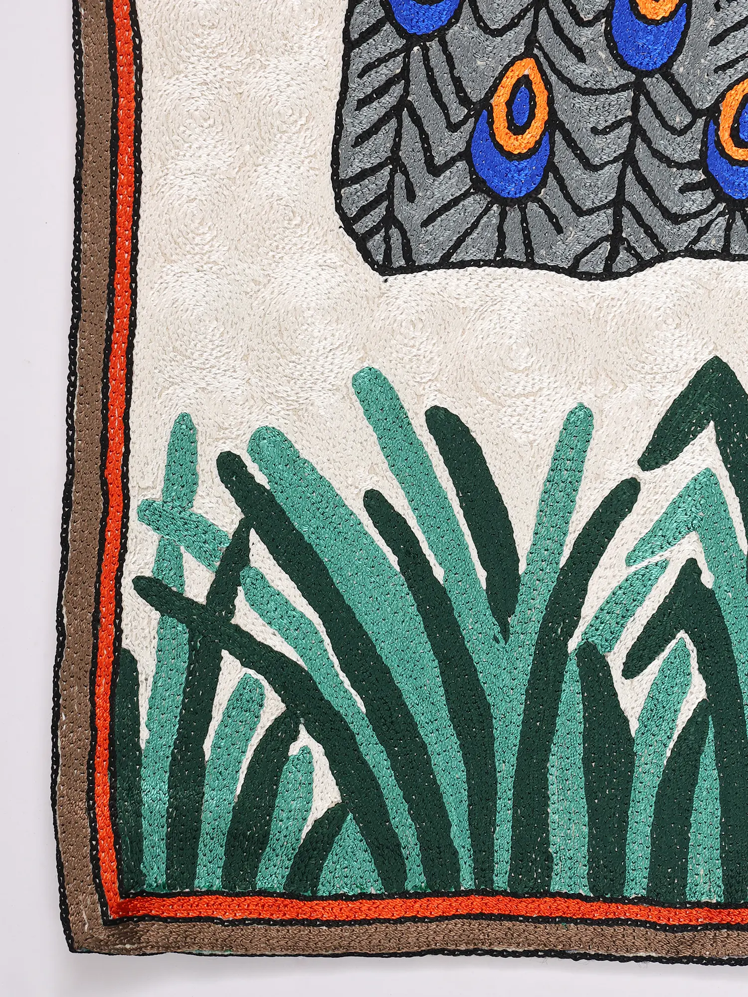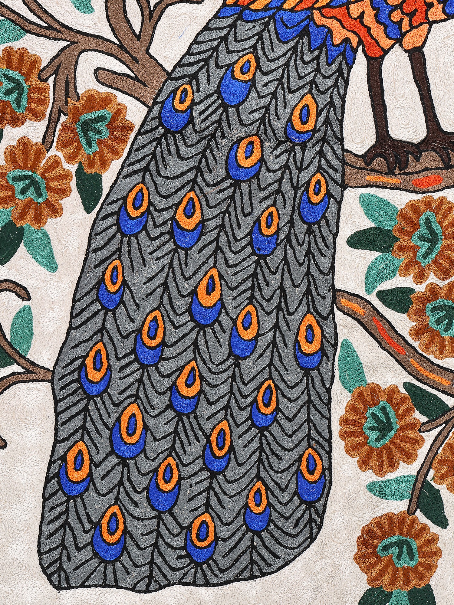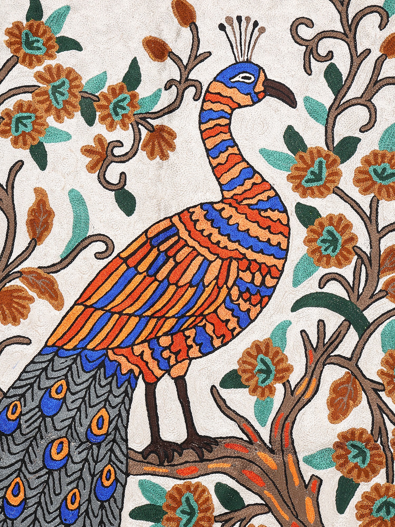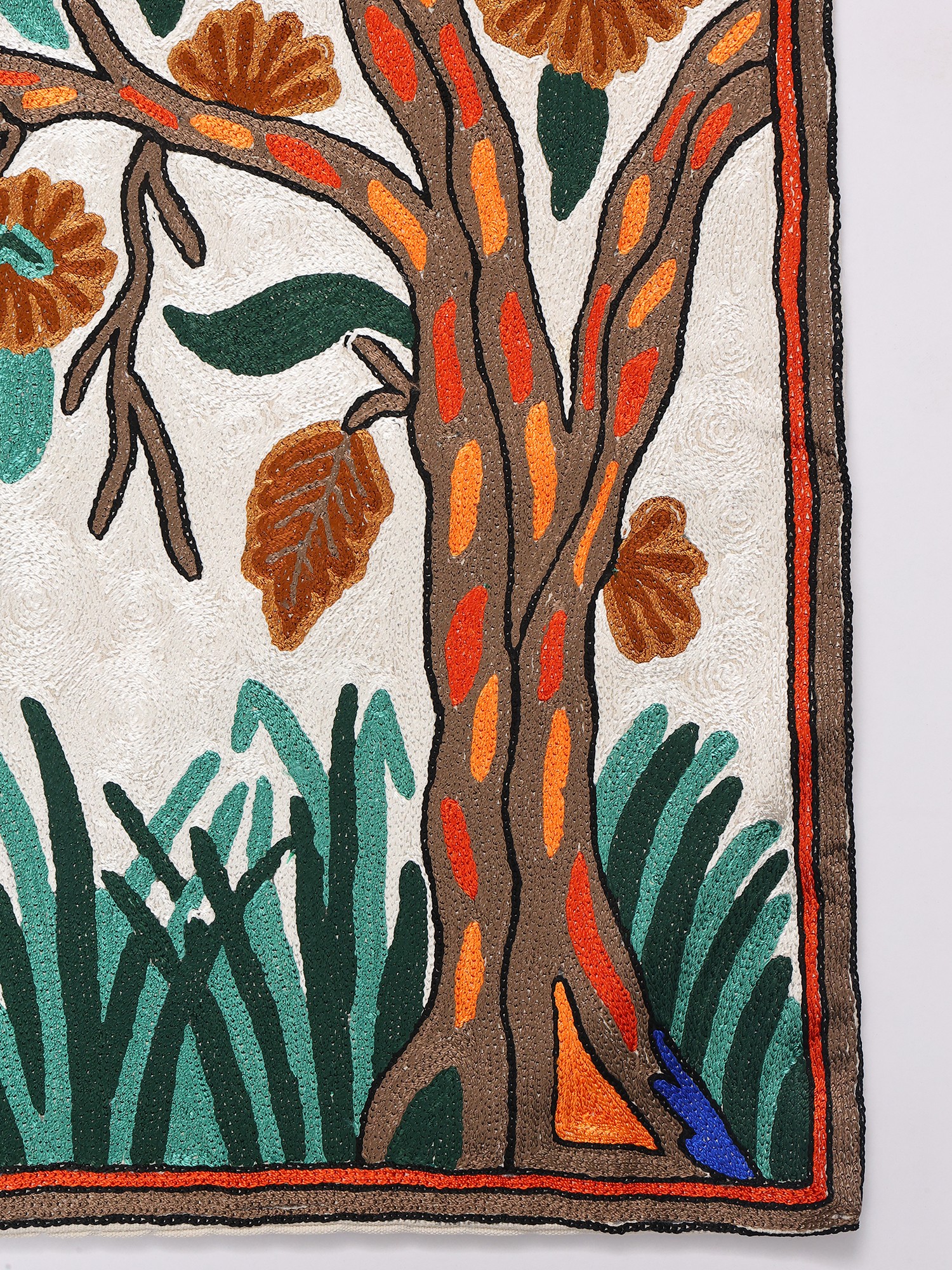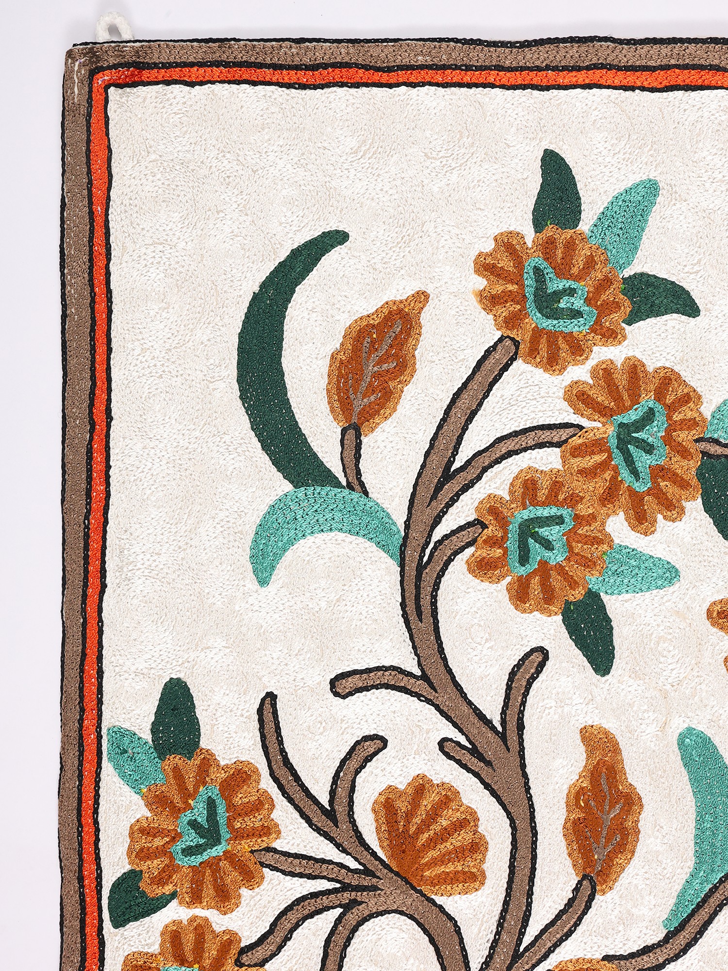 Off-White Chain Stitched Kashmiri Carpet with Floral Silk Threadwork