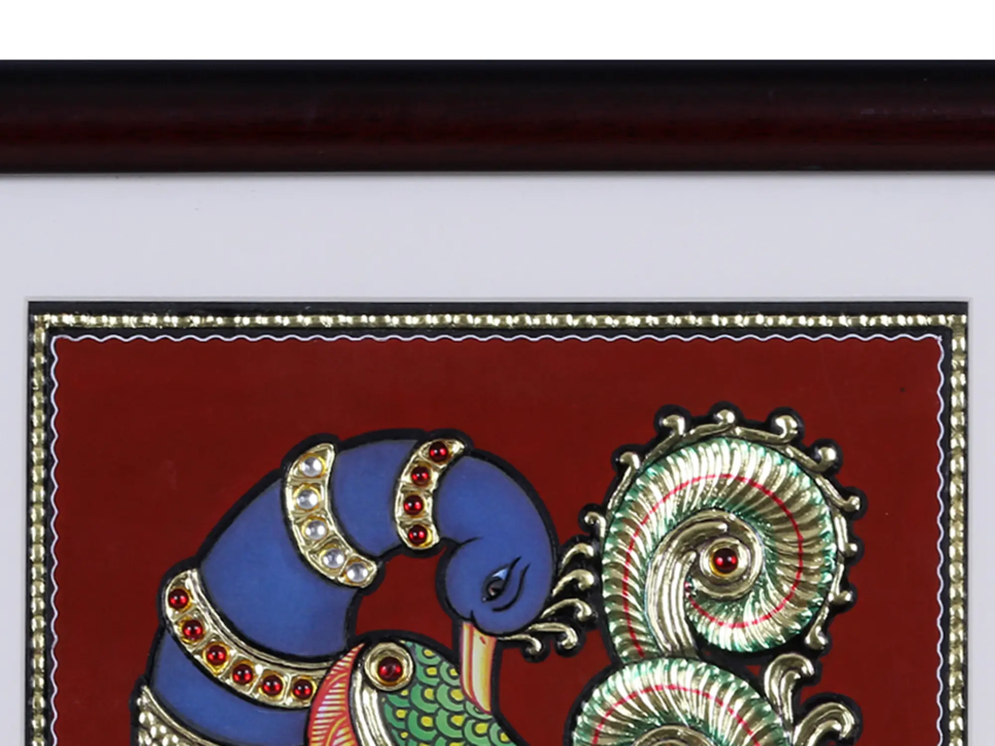 The hallmark of Tanjore art is its lavish use of gold foil, and this piece is no exception. Delicate yet impactful, the gold foil work imbues the peacock with a radiant glow, highlighting its intricate feather patterns and adding a divine dimension to the composition. Each curl of the tail, each feather on the body, is adorned with shimmering gold, catching the light and creating a dynamic visual experience. Accented with carefully placed gemstones, the artwork sparkles with subtle yet captivating brilliance, reminiscent of royal treasures. The interplay of gold and vibrant colors—deep blues, emerald greens, and warm oranges—creates a harmonious and visually arresting tableau that draws the eye and sparks admiration. ––––––––––––––––––––