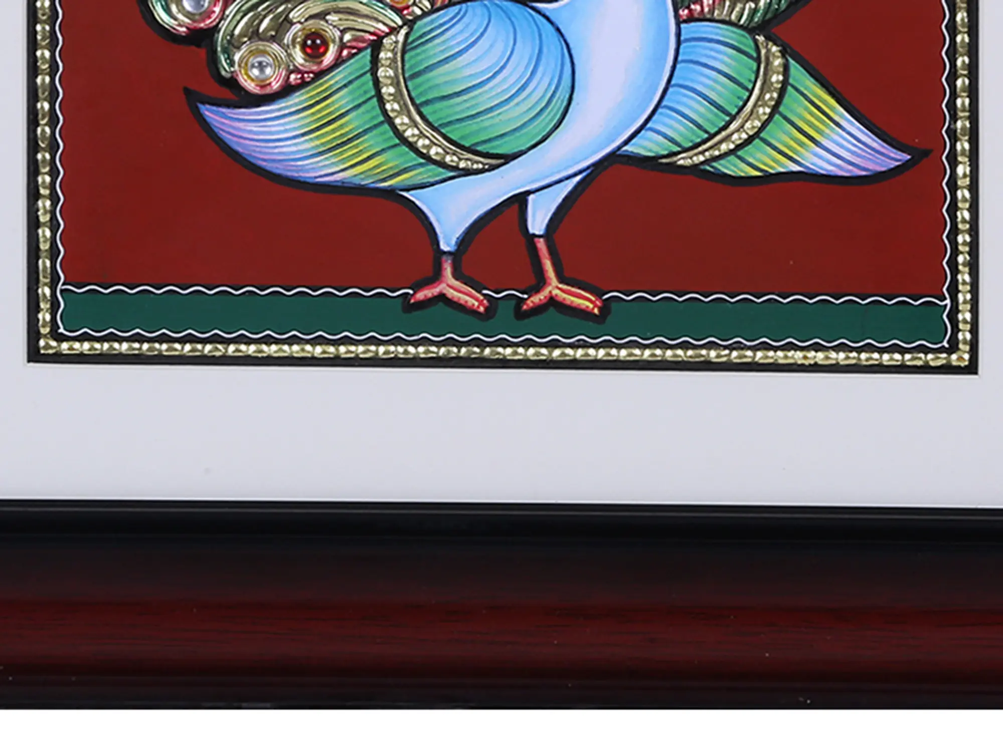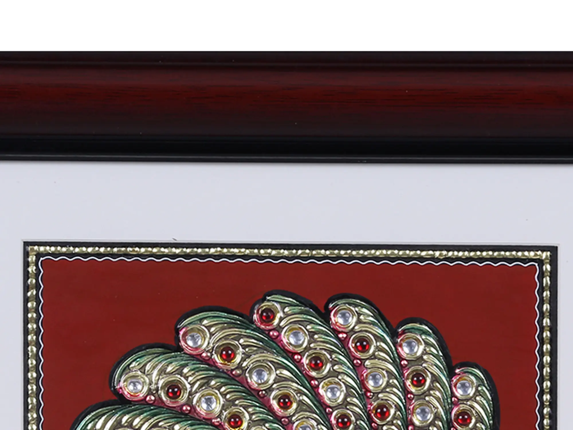 Bring the enchanting beauty of a peacock in full display into your home with this exquisite piece of Tanjore art. Celebrated for its intricate detailing and rich cultural heritage, Tanjore paintings originate from the southern Indian city of Thanjavur and are renowned for their opulent use of gold foil and vibrant colors. This particular artwork captures the peacock at its most magnificent, its tail fanned out in a dazzling display of iridescent feathers.