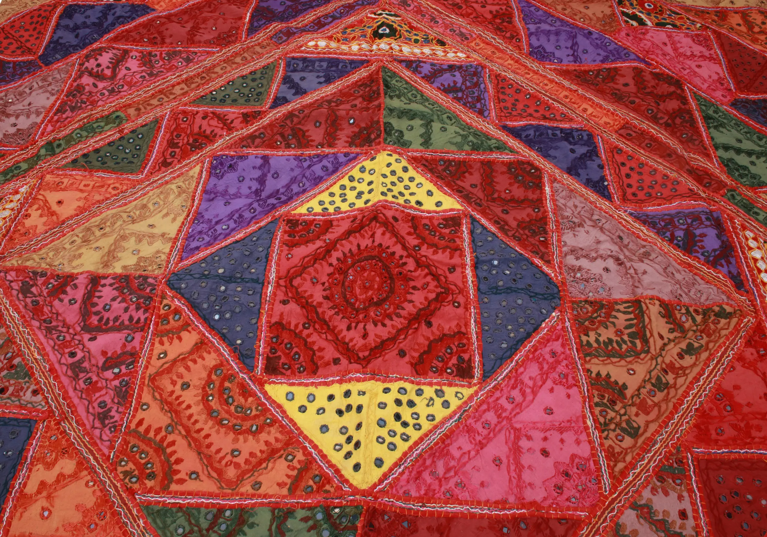 Introduce a splash of color and global artistry to your bedroom with this unique bedspread. Crafted in the heart of Gujarat, India, it embodies the rich textile traditions of the region. The entire piece is a captivating mosaic of vibrant hues and intricate patterns, promising to transform your sleeping space into a haven of style and comfort. The bedspread's design is a celebration of geometric shapes, artfully arranged to create a visually stunning composition. Each piece of fabric tells a story, bearing witness to the meticulous handiwork of skilled artisans. From rich reds and oranges to soothing purples and greens, the color palette is both bold and harmonious, offering a kaleidoscope of visual interest.