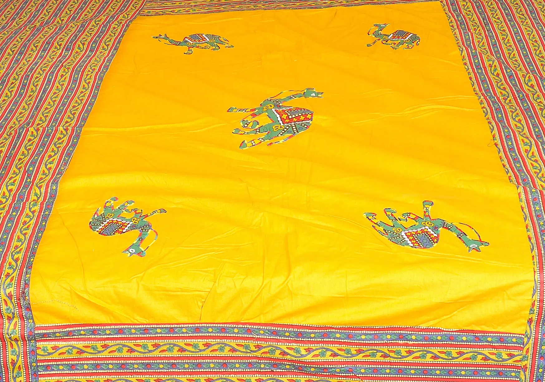 Transform your bedroom into a desert oasis with the Printed Bedspread from Gujarat, adorned with applique embroidered camels. Each camel embodies the spirit of the desert wanderer, adding a touch of whimsy to your sanctuary. The vibrant colours reflect Gujarat's rich textile heritage, inviting you to embark on a journey of discovery and adventure. Let the bedspread be your gateway to the mystical allure of the desert, where every dream is woven with threads of wanderlust and imagination.