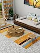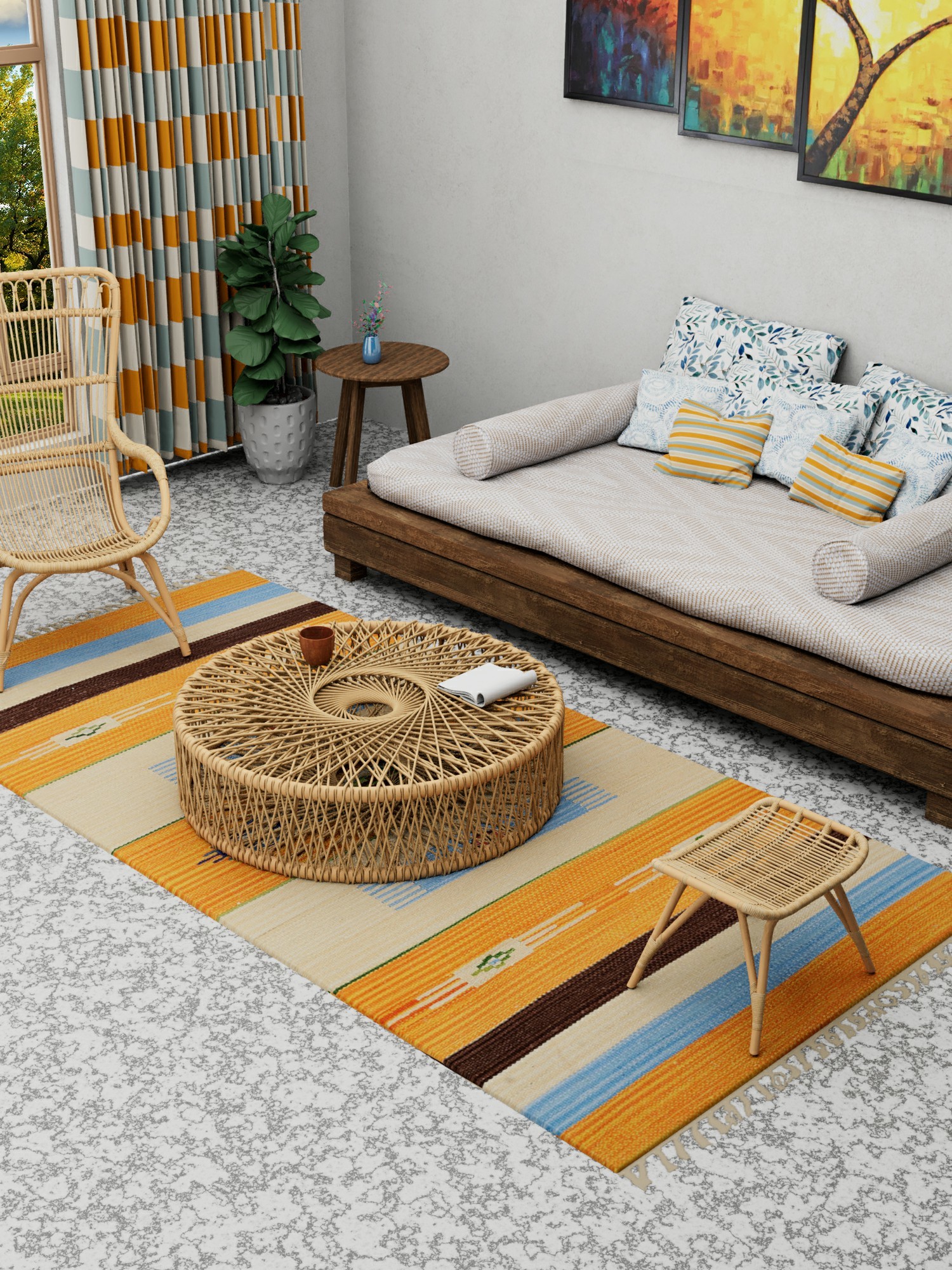 Imagine stepping onto a warm, inviting rug that instantly brightens your day. This beautiful durri is handwoven with care in Sitapur, India, a region renowned for its rich textile traditions. The cheerful palette blends radiant yellow hues with the soft elegance of ivory, creating a captivating visual appeal that will enliven any room. More than just a floor covering, it's a statement piece that reflects a commitment to handcrafted artistry and vibrant design. Each thread tells a story of skill and dedication, bringing a touch of authentic Indian charm to your home.