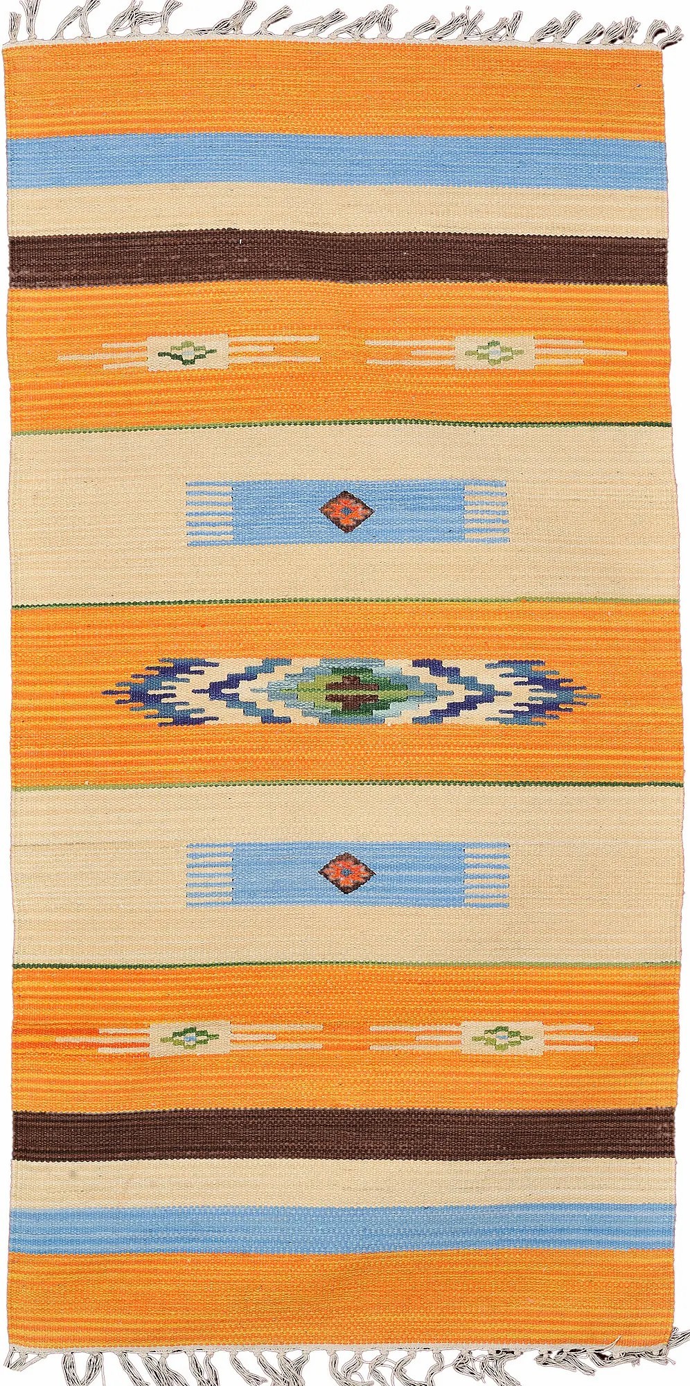 The rectangular dimensions of this durri make it exceptionally versatile. Its size is perfect for placing beside your bed, in front of your sofa, or as a welcoming accent in your entryway. The horizontal stripe pattern and subtle geometric details add visual interest without overwhelming your existing decor. The playful use of color, combined with the classic design, allows it to seamlessly integrate into a variety of interior styles, from bohemian to modern. Let this durri be the finishing touch that ties your room together, adding warmth, texture, and a touch of global flair.