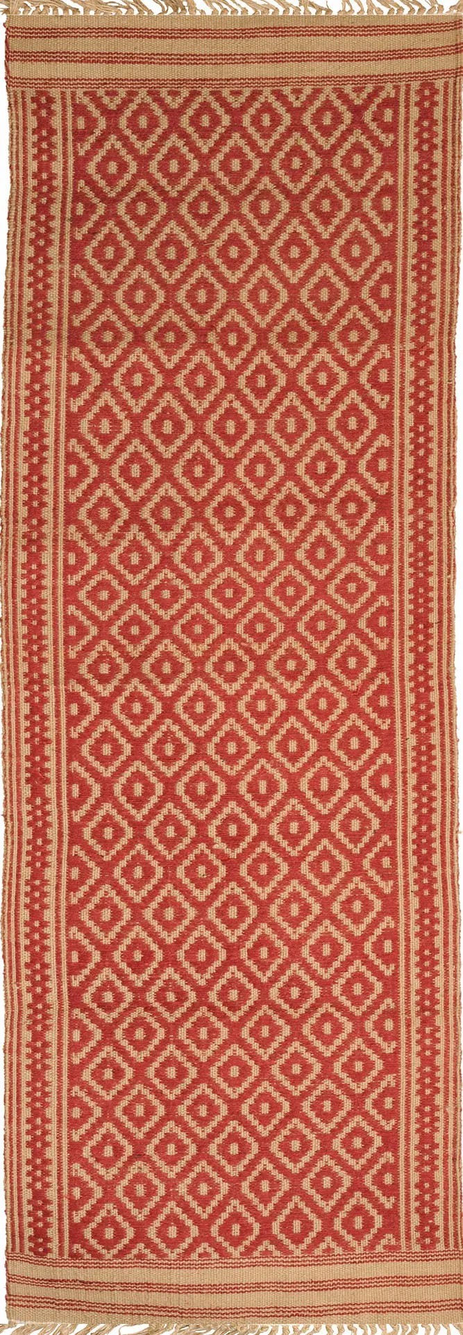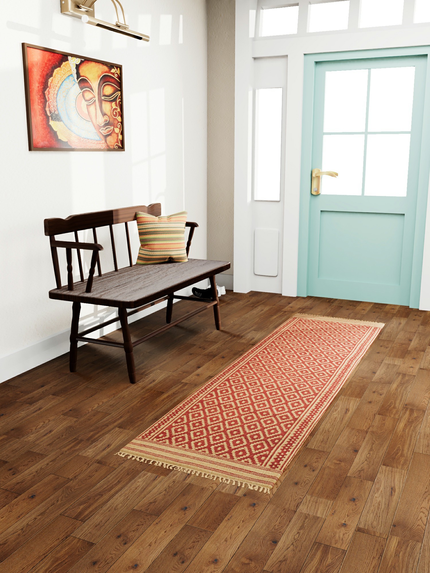 The color palette of red and beige creates a harmonious blend of vibrancy and neutrality, making it a versatile addition to various interior styles. The red provides a warm, inviting feel, while the beige adds a touch of natural elegance. The diamond-shaped bootis offer a classic geometric pattern that is both timeless and visually engaging. These carefully woven details catch the eye and add a layer of sophistication to the overall design. The contrasting colors and patterns create a sense of depth and movement, making it a focal point in any room. The fringes at the ends add a playful and decorative touch, further enhancing its visual appeal.