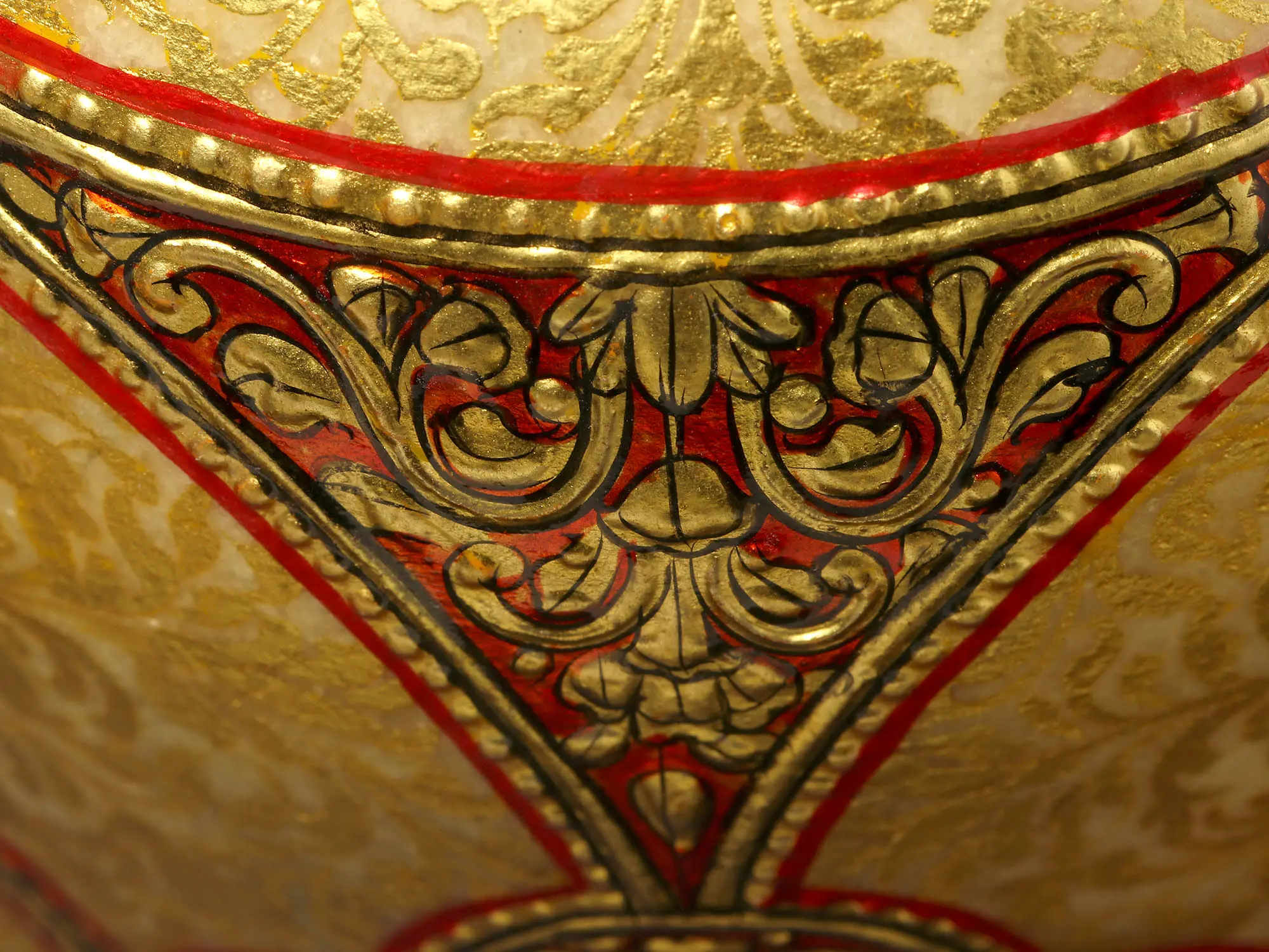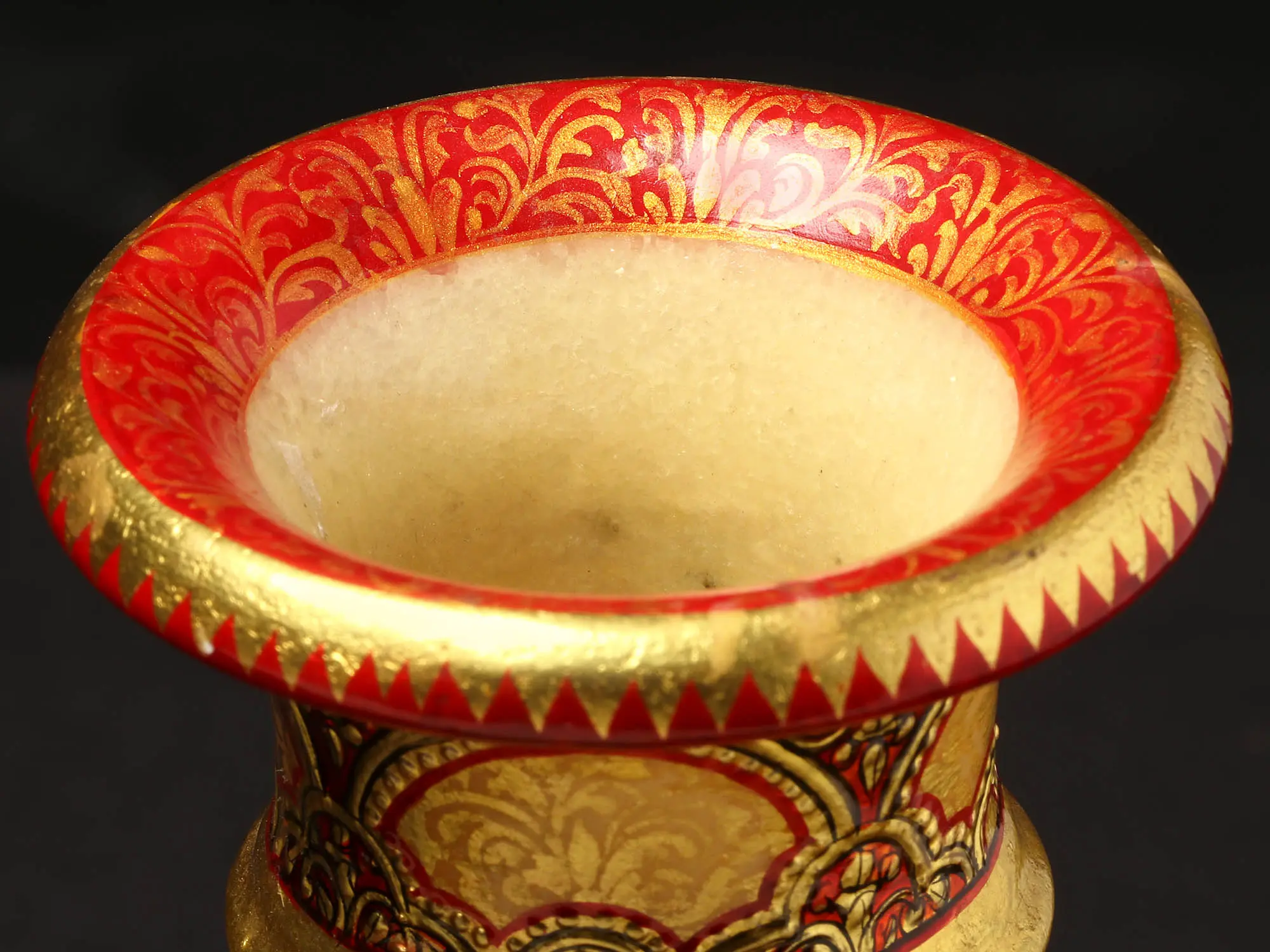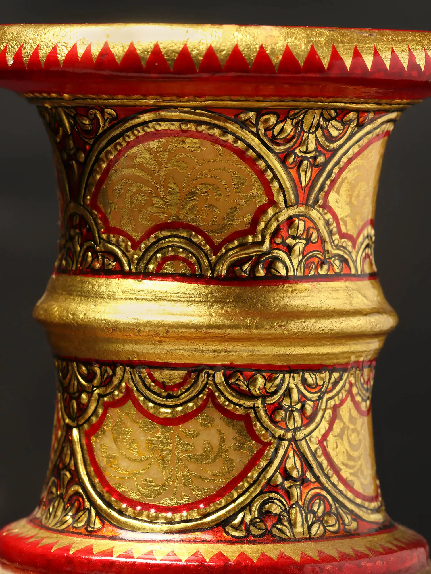 Such a vase would be a one-of-a-kind addition to your space. Its relatively wide mouth is rimmed with red and gold triangles, which tapers down into a sturdy neck superimposed with luxuriant proportions of colour. A thick gold band sets apart the layers of the neck, which in turn widens into a broad middle. The same tapers subtly down to the bottom of the vase, which is the same diameter and features the same geometric motifs as the mouth. Such a vase would become a bouquet of flowers as it would an exceptional solitary flower.