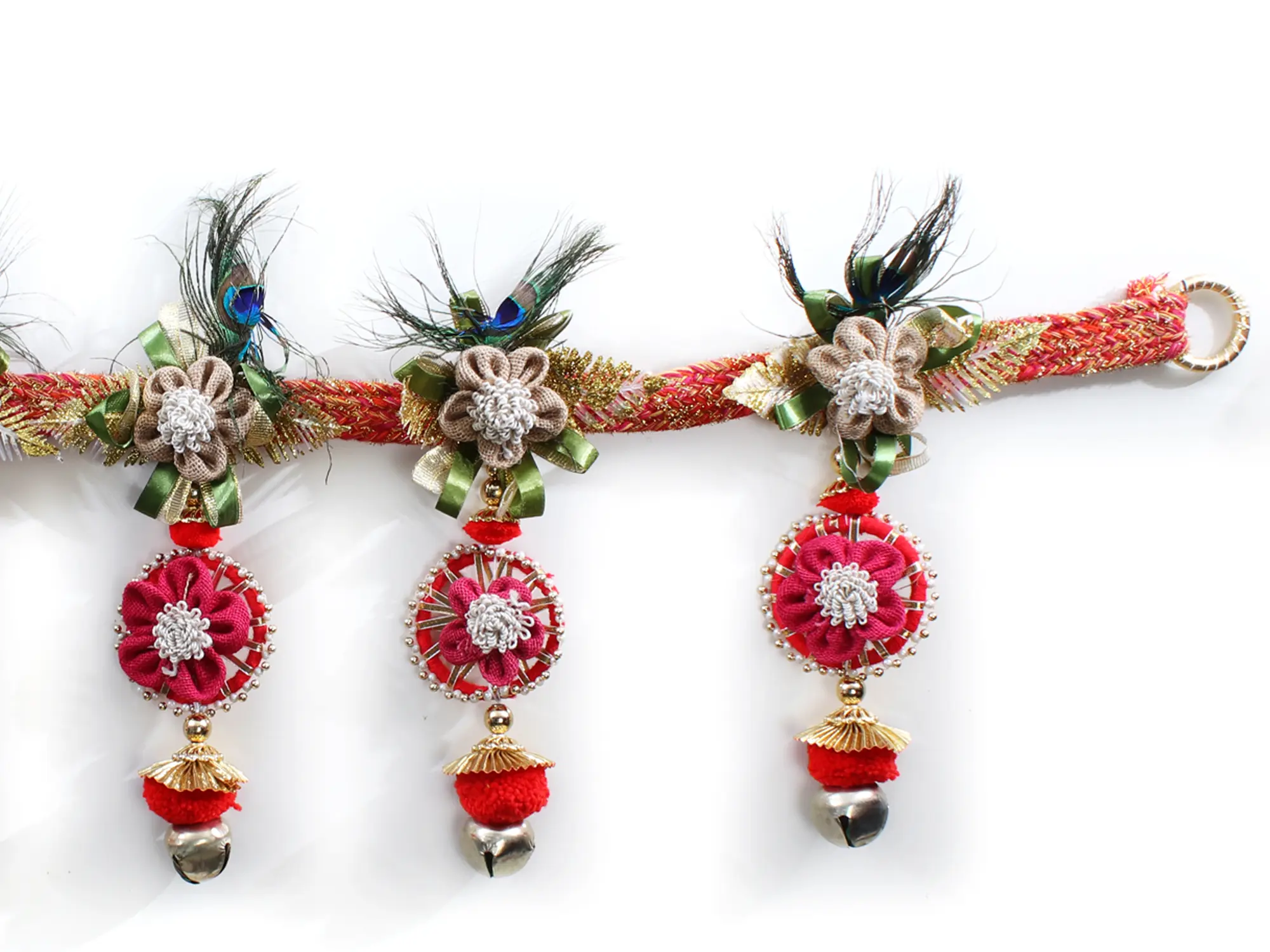 In Hindu tradition, Toran is considered auspicious and is associated with the “goddess Lakshmi,” also known as “Prasadabhimukhi (the One who grants boons),” who is the deity of wealth and prosperity. Adorned with the majestic elegance of peacock feathers and pom-pom balls and tinkling bells dance in harmony, this work of art exudes a playful charm. Symbolising prosperity and protection, this toran invites good fortune and warding off negativity. Handcrafted from jute, this toran is an eternal adornment for your sacred threshold.