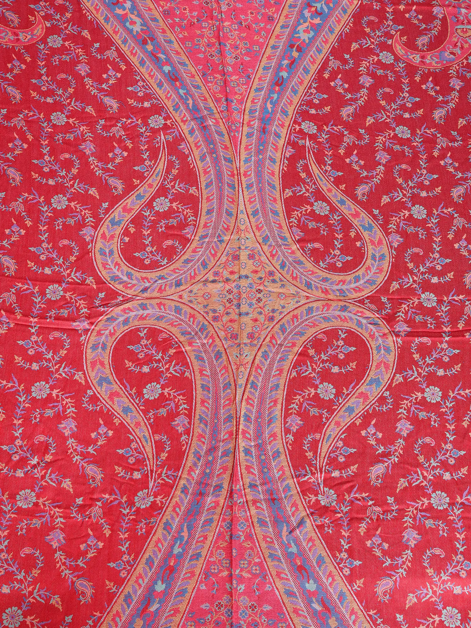 The dominant crimson hue serves as a vibrant backdrop for the intricate dance of paisley and floral elements, rendered in a palette of soft blues, yellows, and purples. This creation measures 107 inches in length and 94 inches in width, generously proportioned to grace your queen-sized bed with an elegant cascade. The reversible design offers you two distinct yet equally stunning presentations, doubling the visual delight.
